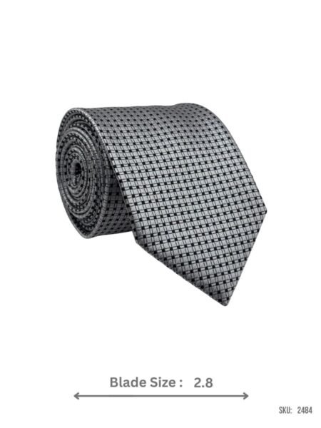 A grey tie with a grid pattern in black, offering a modern and stylish touch for formal outfits.