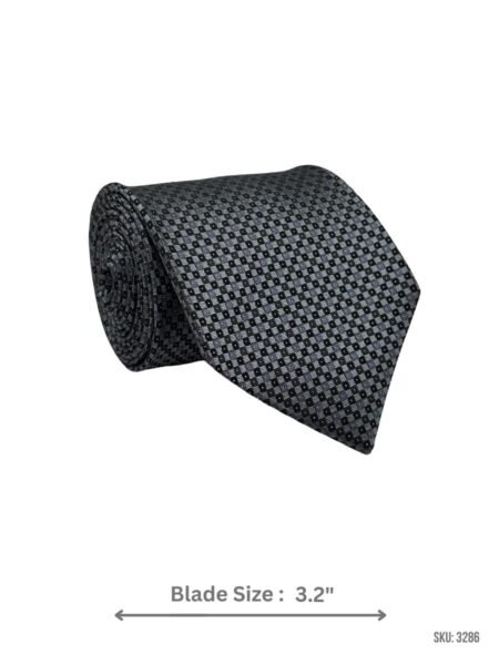 A smart grey tie featuring a black and silver micro square pattern with white micro dots for a clean and modern formal look. Ideal for office wear, meetings, and special occasions.