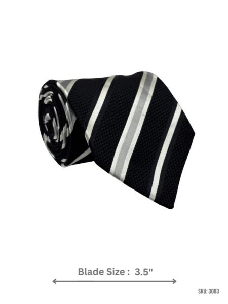 Elegant black tie featuring bold silver diagonal stripes for a classic look.