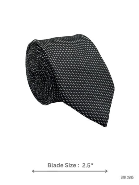 A sleek black tie featuring a silver diagonal dash micro pattern for a sharp and modern formal look. Ideal for office wear, dinners, and special occasions.