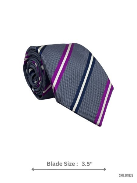 Upgrade your outfit with this gray tie featuring eye-catching stripes in purple, white, and navy. Its classic 3.5-inch width pairs well with most suits, making it a great choice for both work and special events.