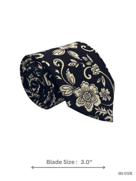 A black tie with an elegant white floral design, perfect for weddings and formal occasions.