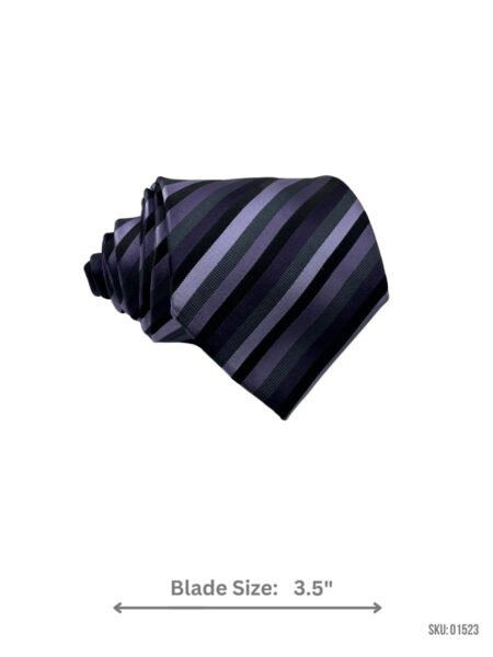 A sleek gray tie with purple and lavender stripes, perfect for modern and formal styles.
