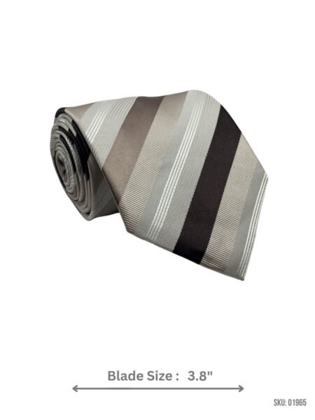 A versatile black tie with grey and beige stripes for a clean, modern look. Ideal for any occasion.