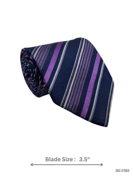Make a statement with this navy tie, featuring bold purple and white diagonal stripes on a 3.5-inch blade. Perfect for formal and professional wear.