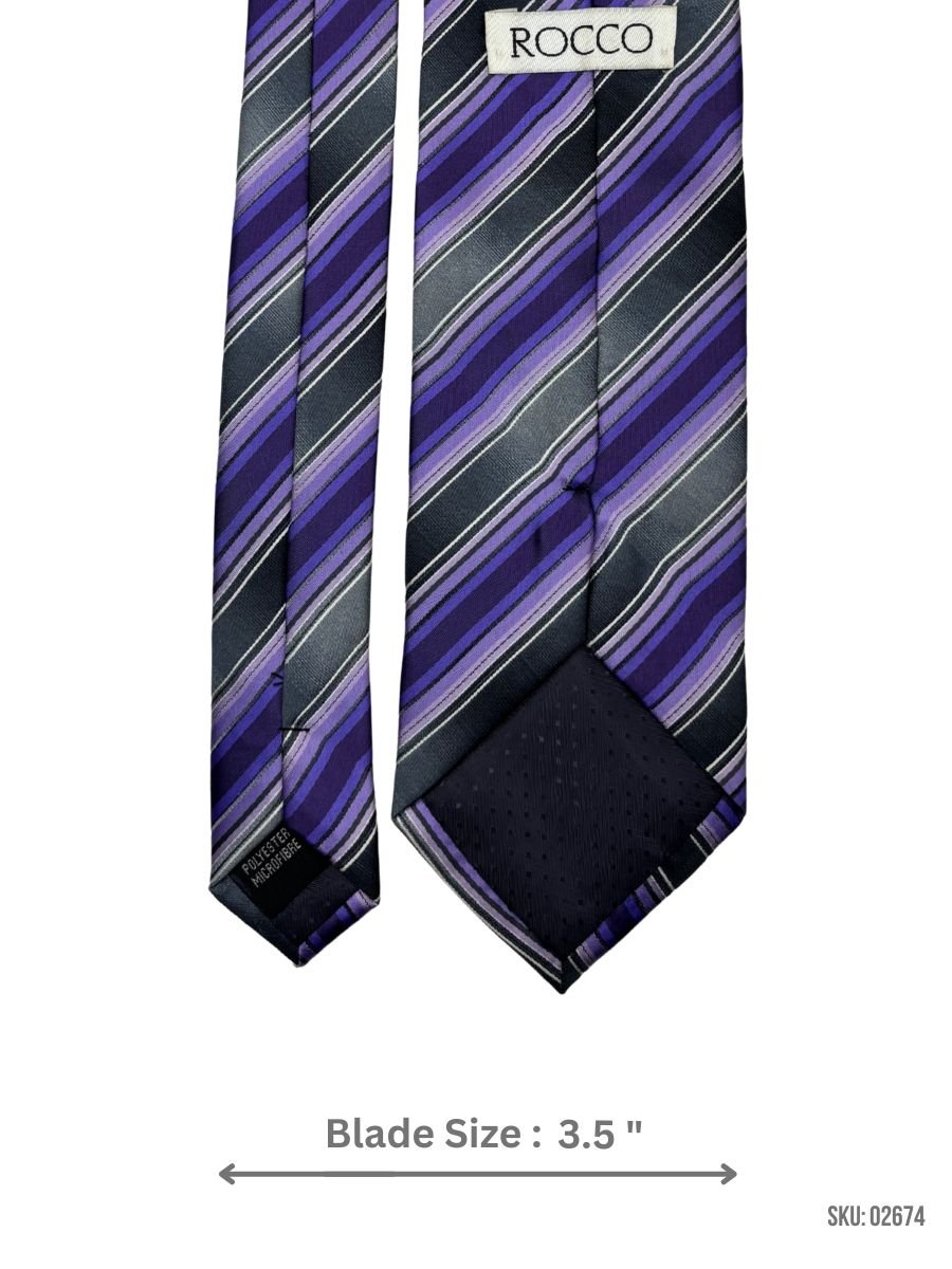 This tie combines black with alternating purple and silver stripes, offering a refined yet striking look. Ideal for business meetings and special occasions, it adds elegance to any outfit.