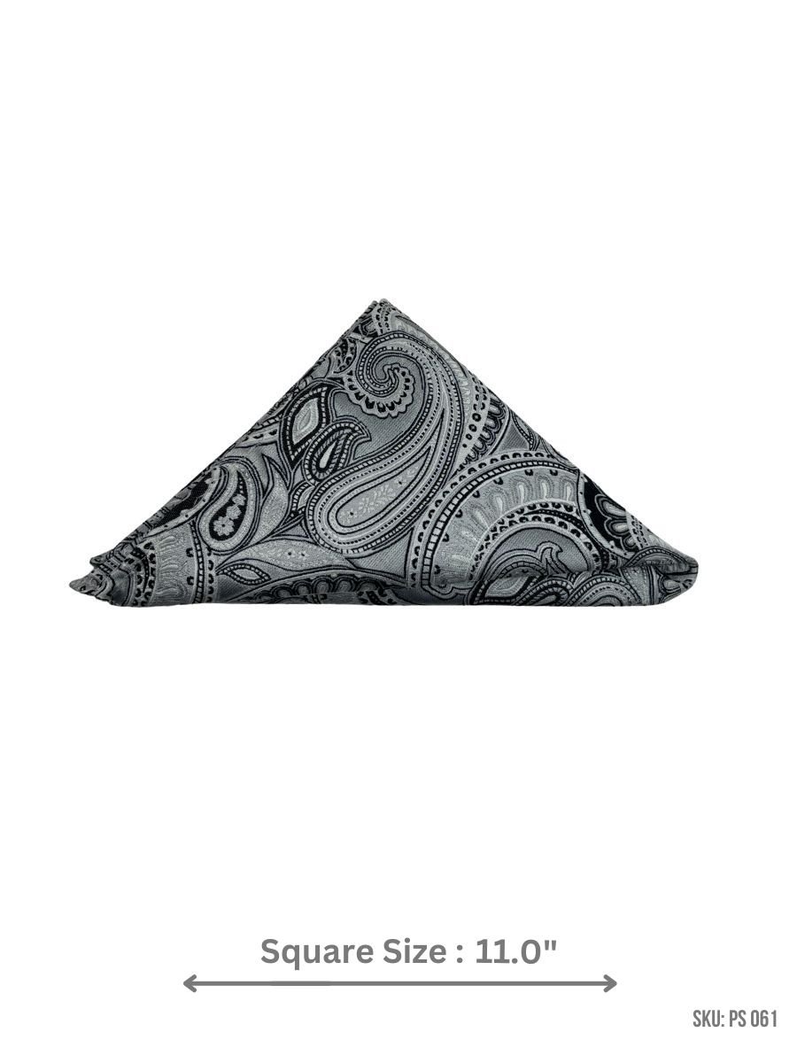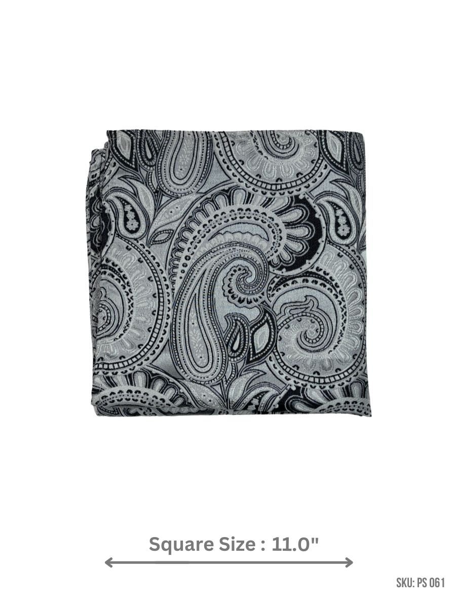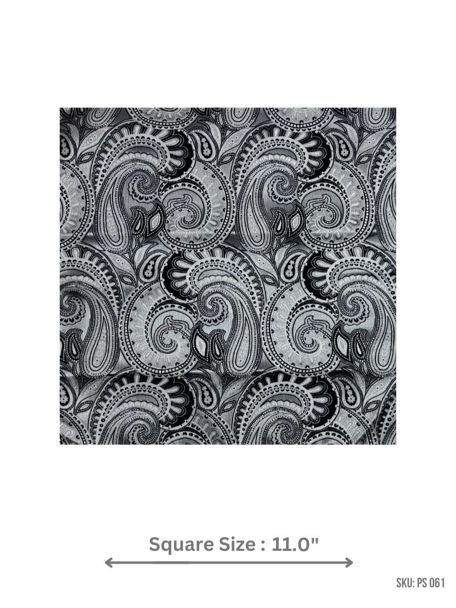 This pocket square features an intricate black and silver paisley design, adding a luxurious touch to your formal attire with a sleek, modern edge.