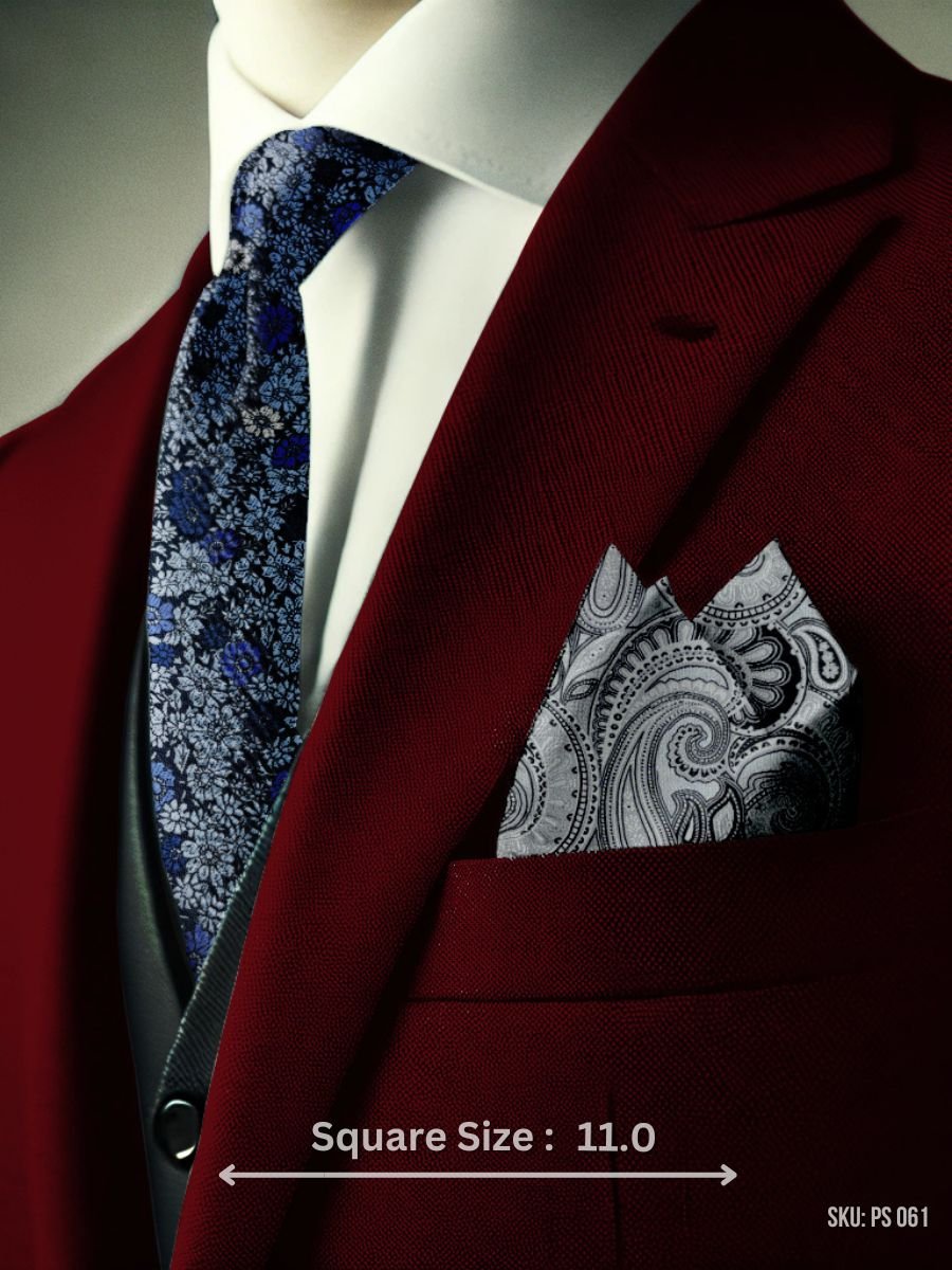 Make a bold yet sophisticated statement with this black and silver paisley pocket square. The 11.0″ size offers the perfect fit, adding just the right amount of elegance to your suit or tuxedo. Ideal for formal occasions such as weddings, galas, or business events, this pocket square blends classic paisley design with modern colors for a timeless look.