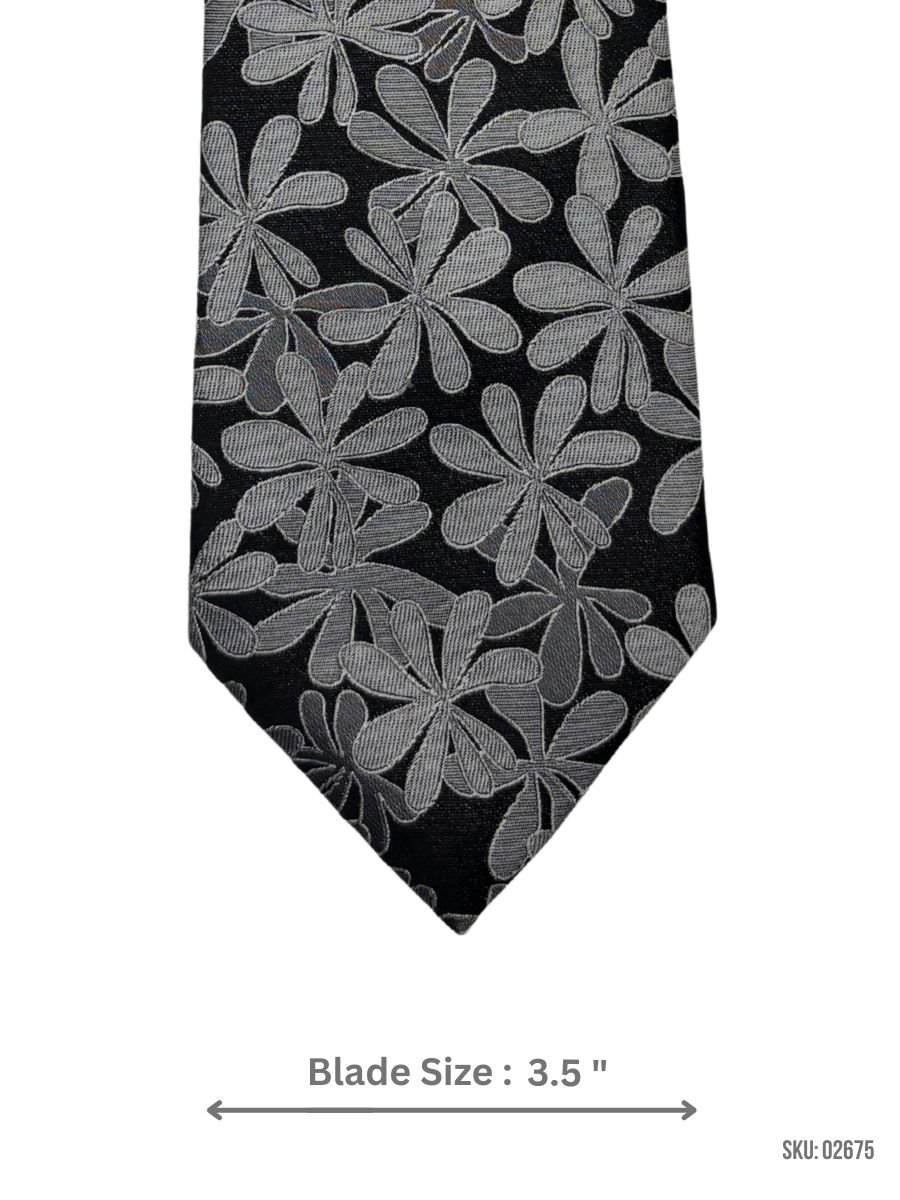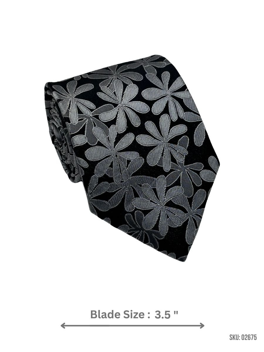 A black tie with an elegant floral design, adding sophistication and style to your formal attire.