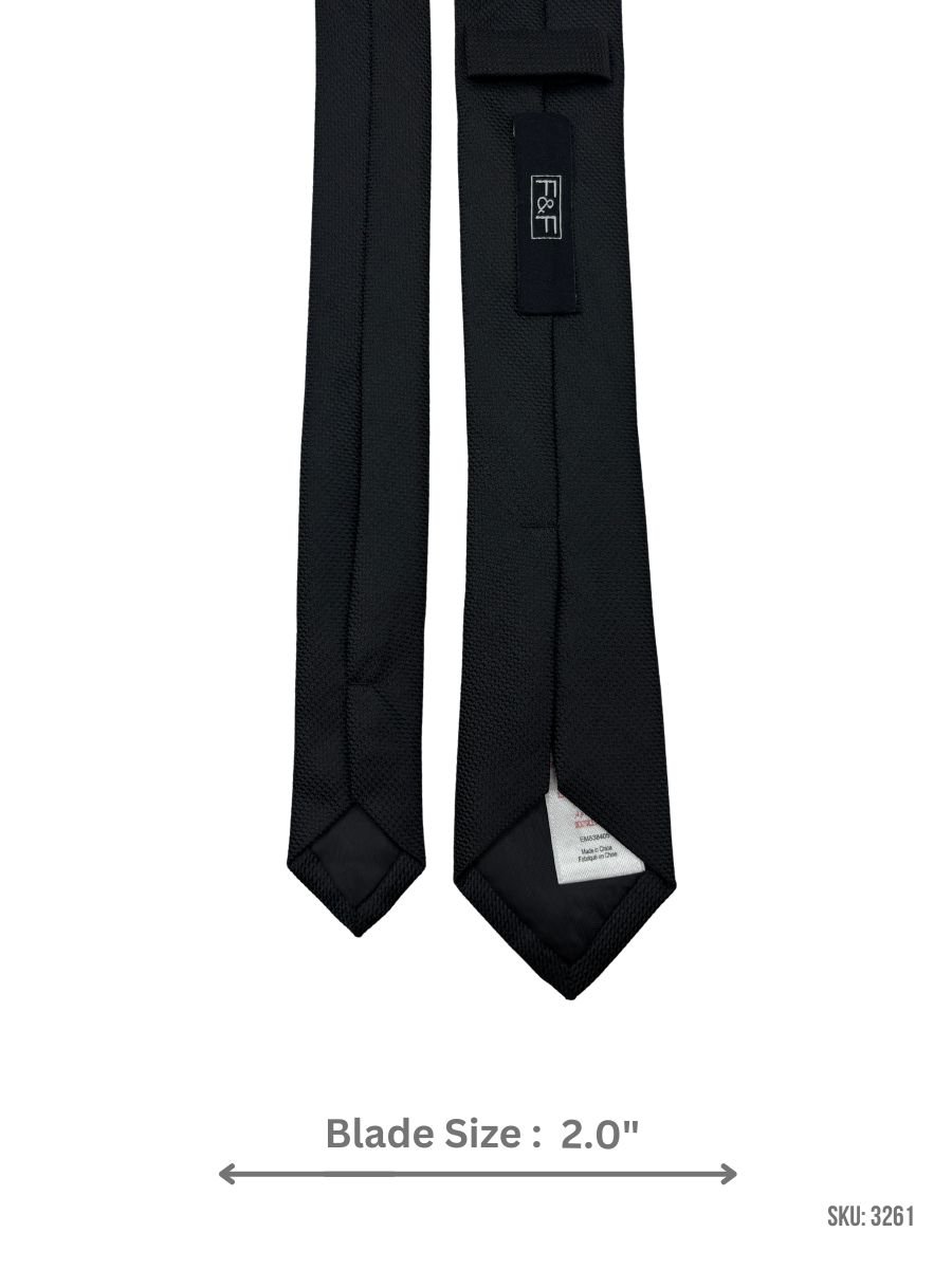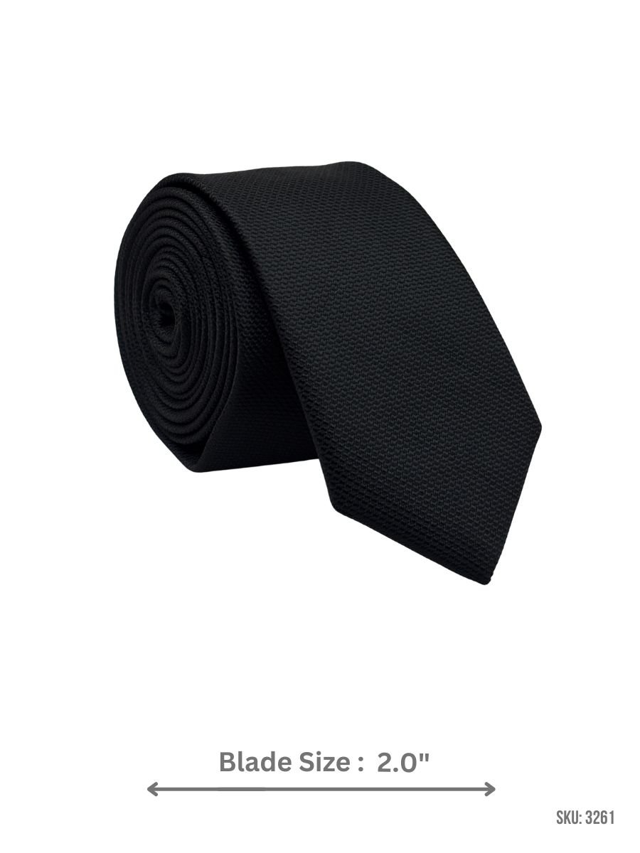 A refined black tie featuring a tone-on-tone pebble-textured weave that adds depth while staying clean and minimal. Perfect for office wear, formal events, and sharp everyday suiting. Blade size: 2.0″.