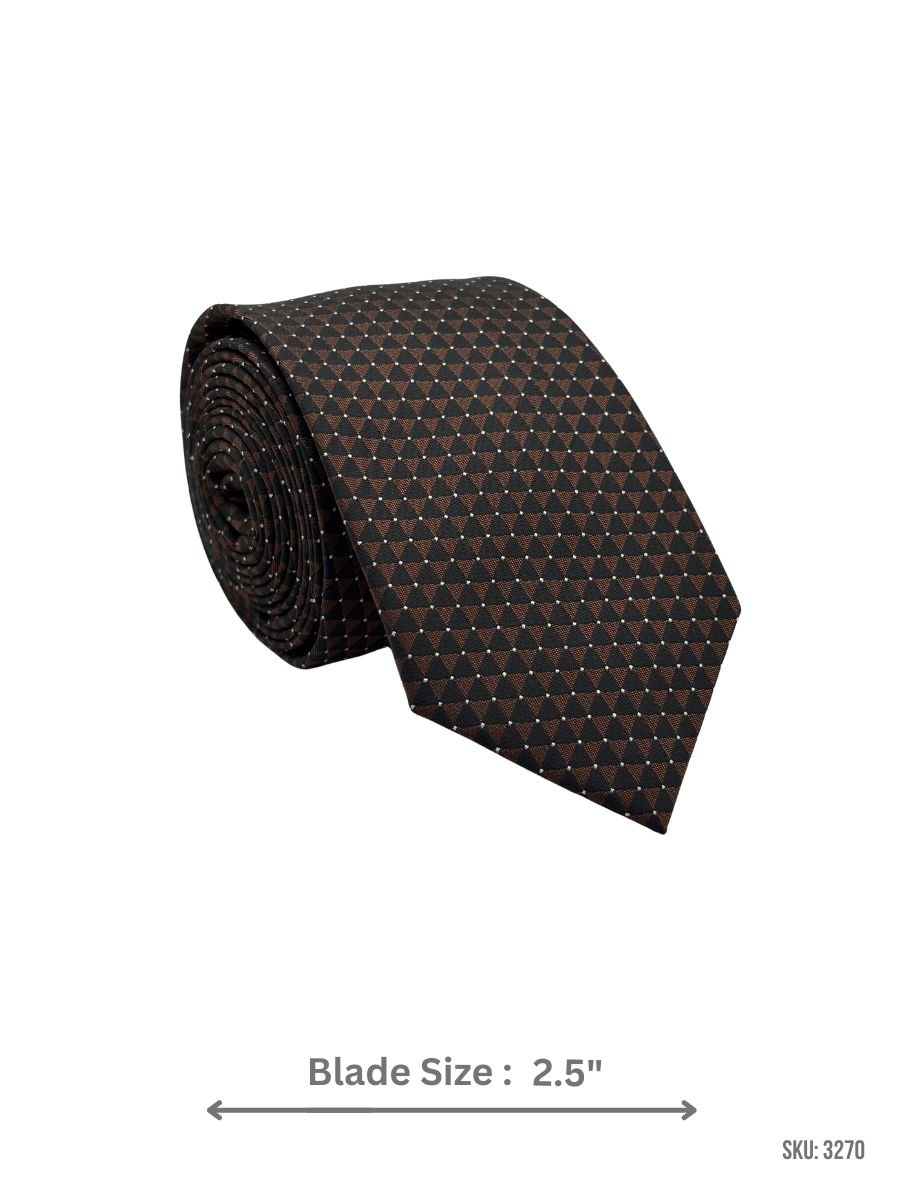 Black tie with a brown triangle geometric pattern and fine white pin dots for a sharp, modern look.