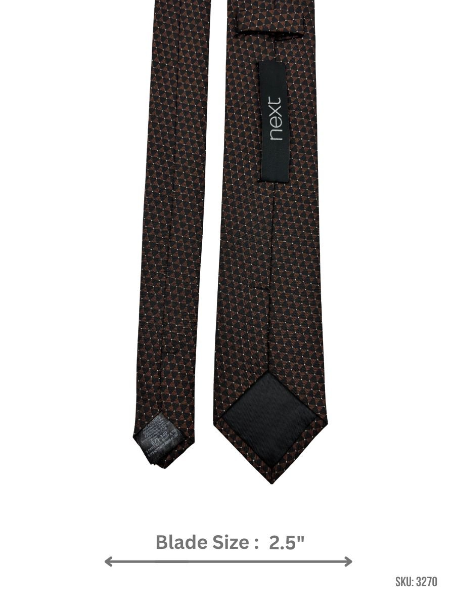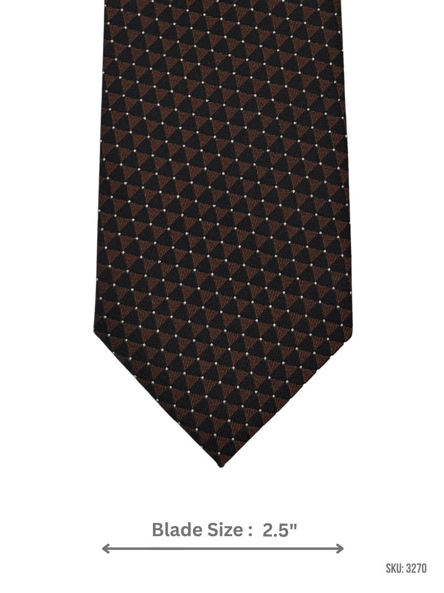 A bold black tie featuring a repeating brown triangle geometric design, finished with subtle white pin dots for clean detail. Great for office wear, meetings, and formal styling. Blade size: 2.5″.
