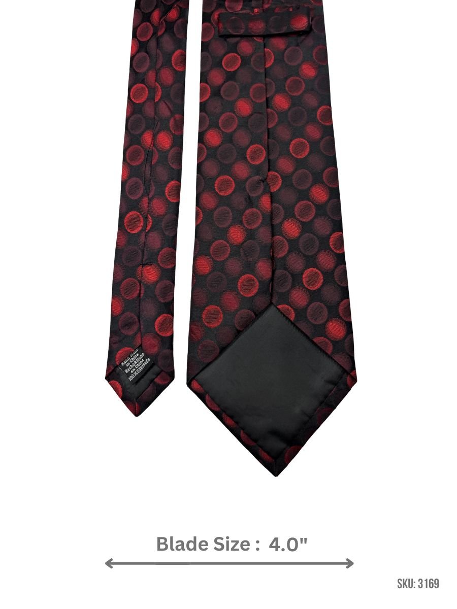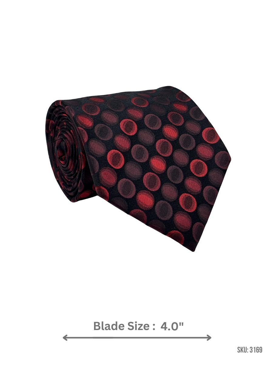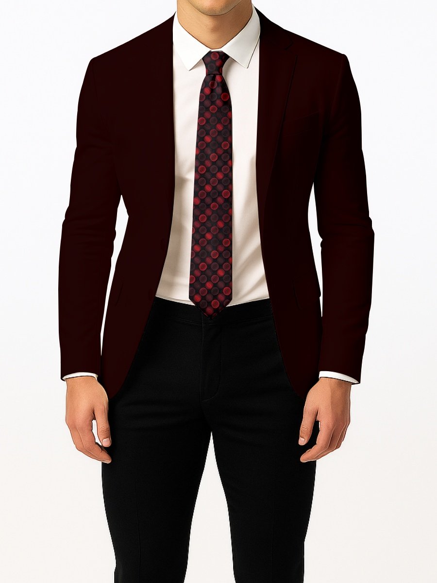A black tie finished with layered burgundy and charcoal polka dots that add rich contrast without looking overly loud. Ideal for dinners, weddings, and formal events when you want a standout accessory.