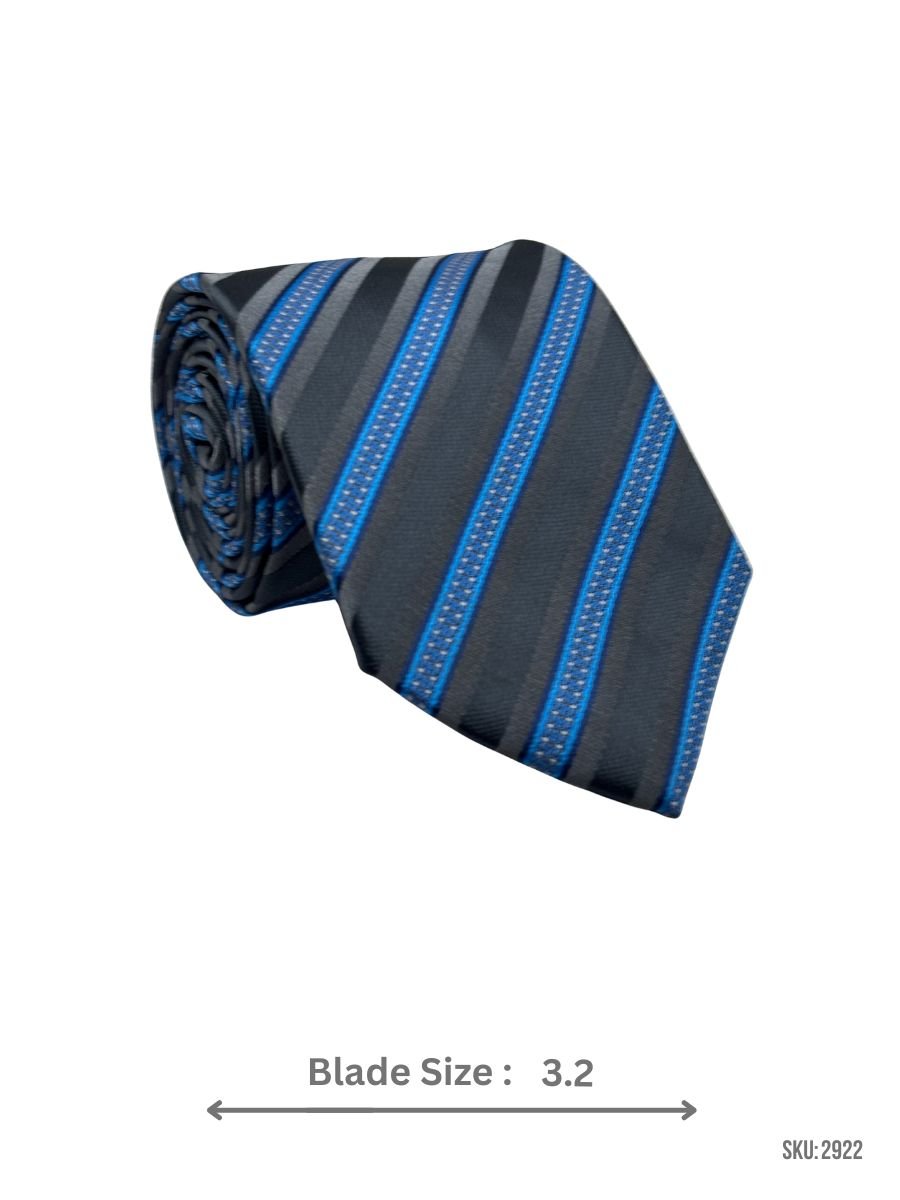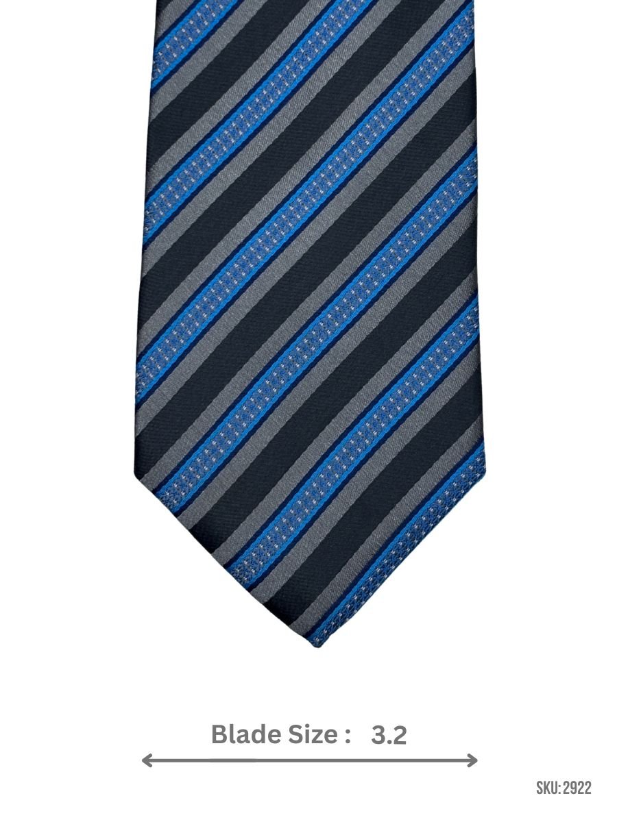 This black tie uses sharp grey and blue striping to create a modern, contrast‑rich formal appearance.