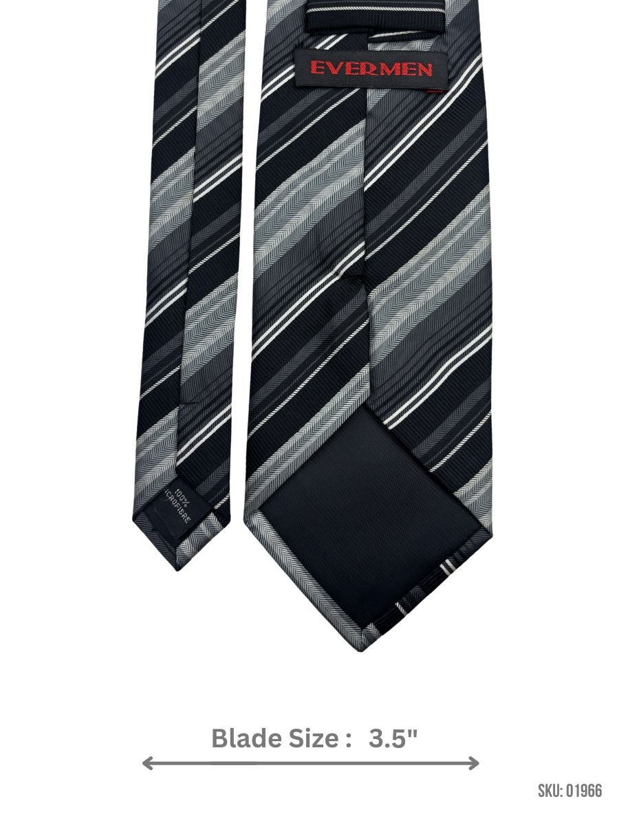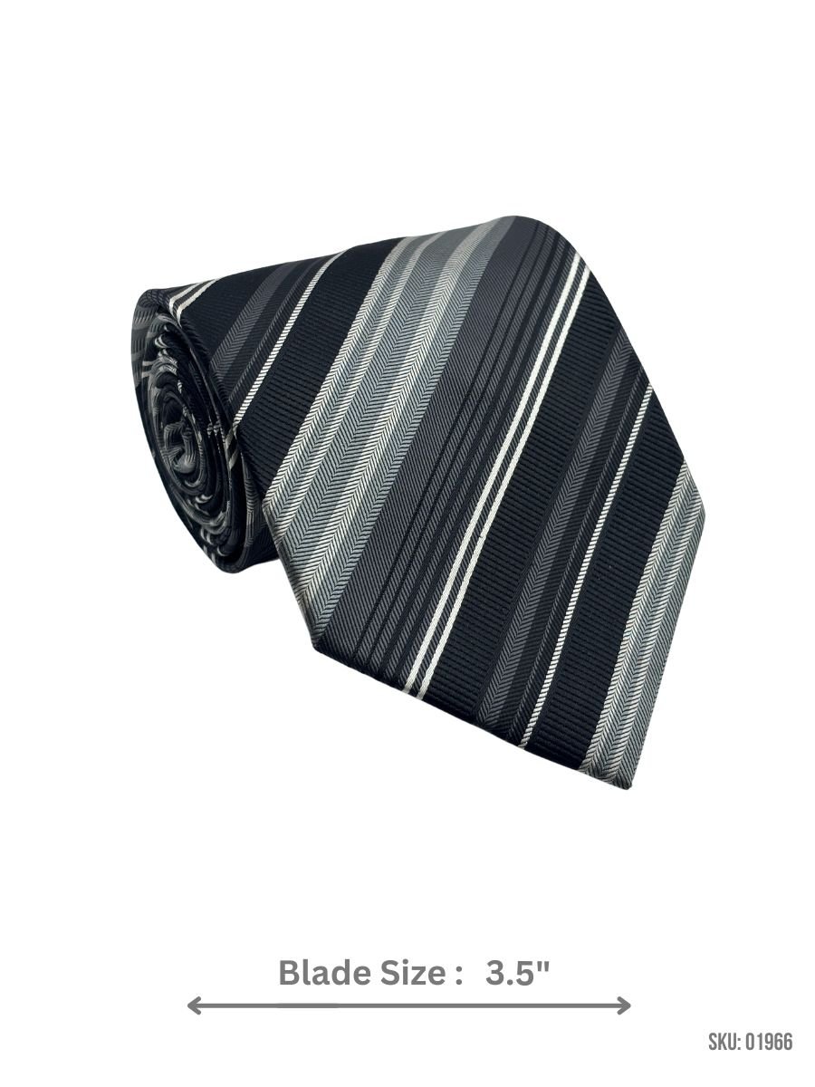 This black tie is designed with subtle grey chevron stripes, offering a contemporary and stylish look. The 3.5-inch blade width creates a sleek and tailored fit, making it perfect for formal occasions, business meetings, or evening events. Made from premium materials, this tie delivers comfort and durability with a sophisticated touch.