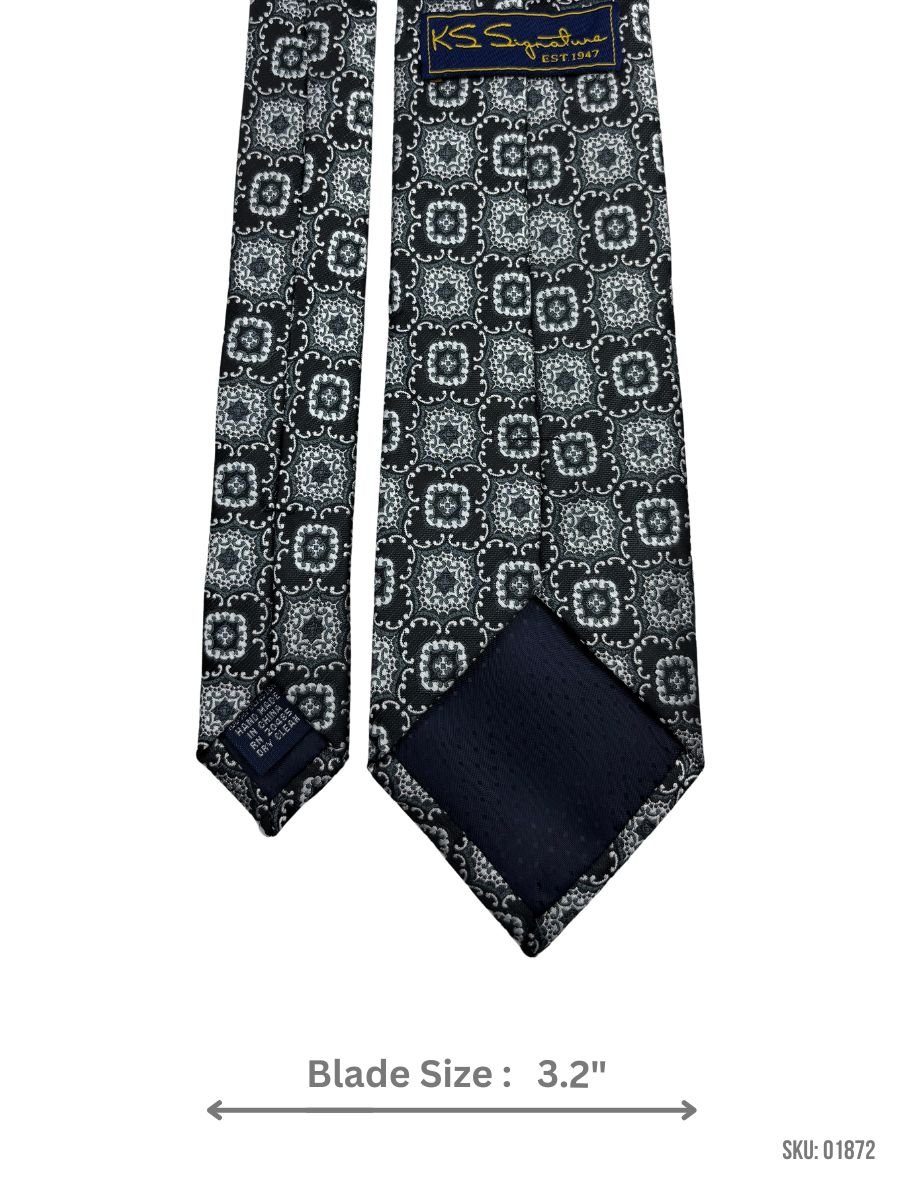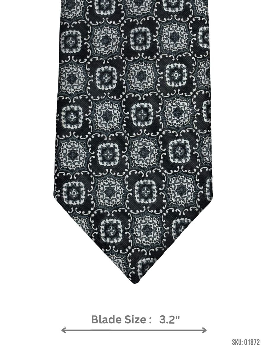 Add a touch of elegance to your wardrobe with this black tie, adorned with an intricate silver medallion pattern. The 3.2-inch blade width delivers a refined, modern look, suitable for weddings, black-tie events, or business meetings. Crafted with high-quality materials, this tie offers exceptional durability and comfort. Pair it with a crisp white shirt and a tailored black or charcoal suit for a polished and distinguished appearance.