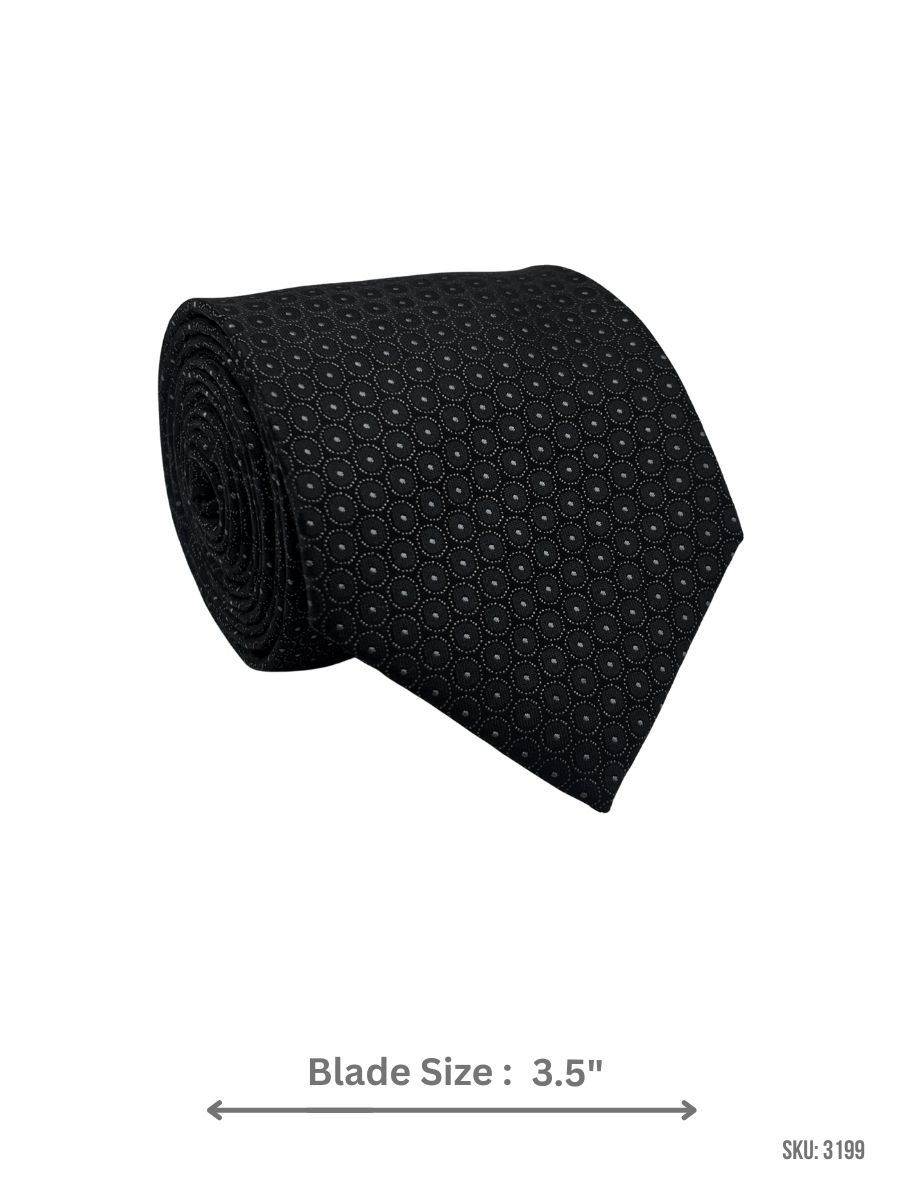 A sleek black tie featuring repeating light gray dotted circle rings that add texture without being loud. Ideal for office wear, meetings, and evening events.