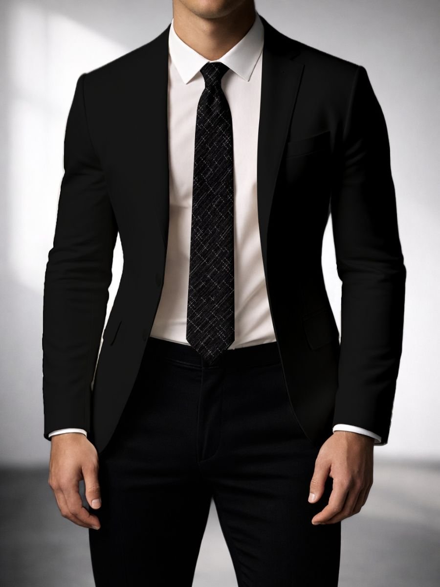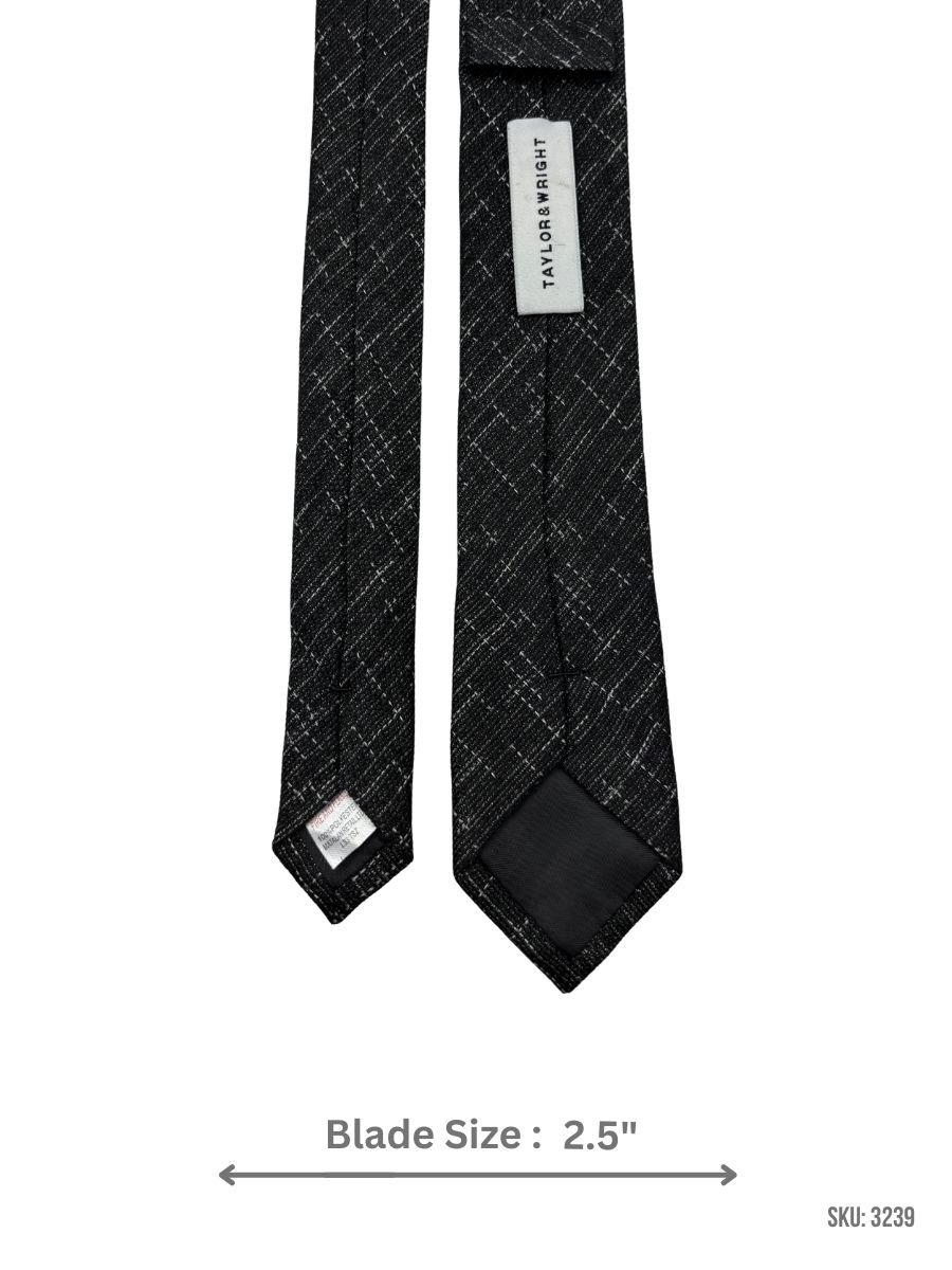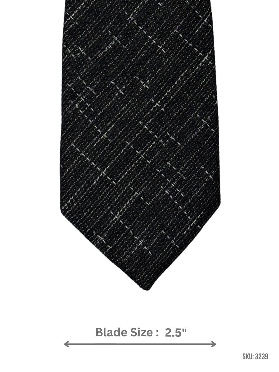 A textured black tie featuring a tweed-inspired crosshatch weave with light gray flecks for subtle depth. A great pick for office wear, meetings, and formal looks when you want something different but still classic.