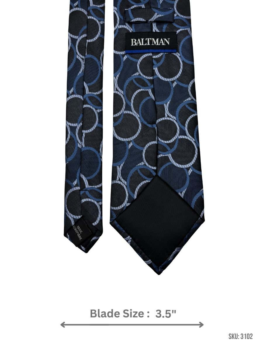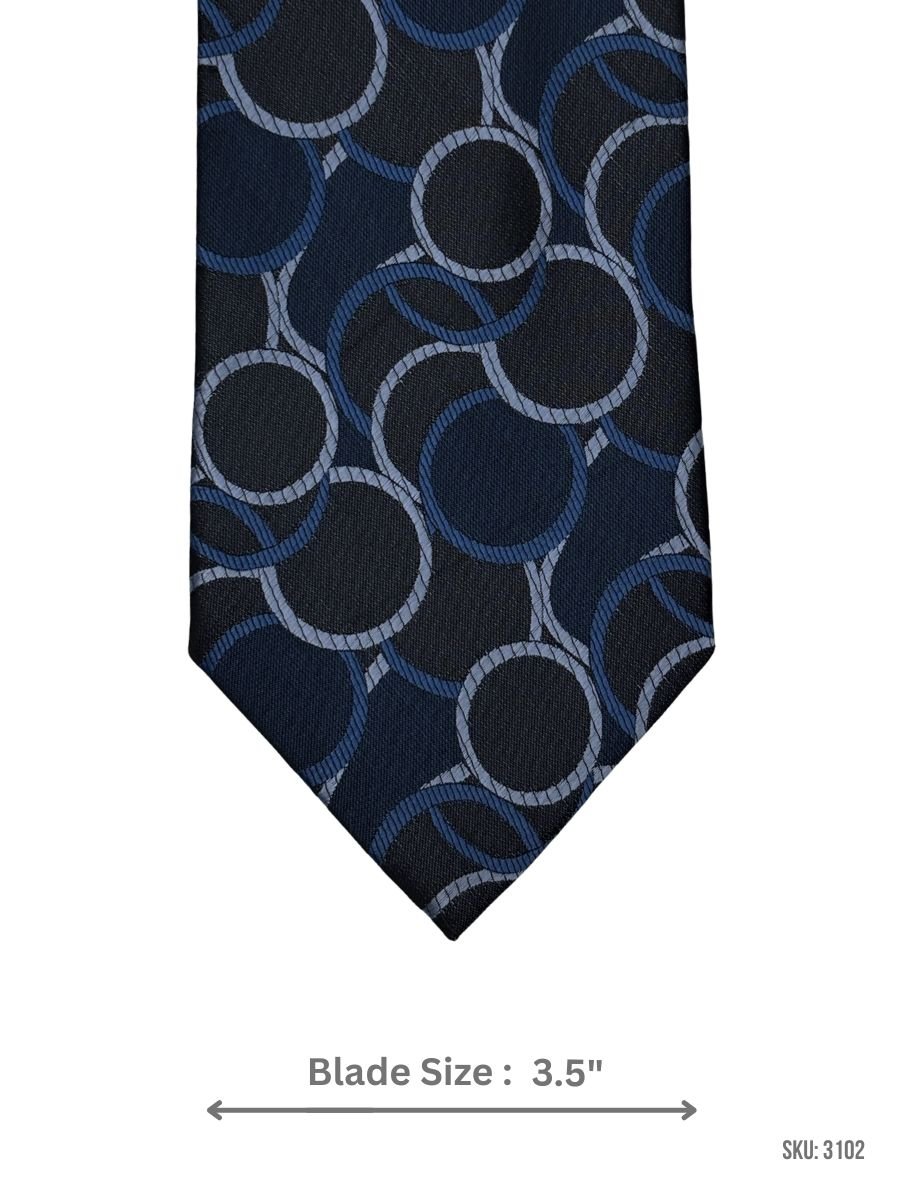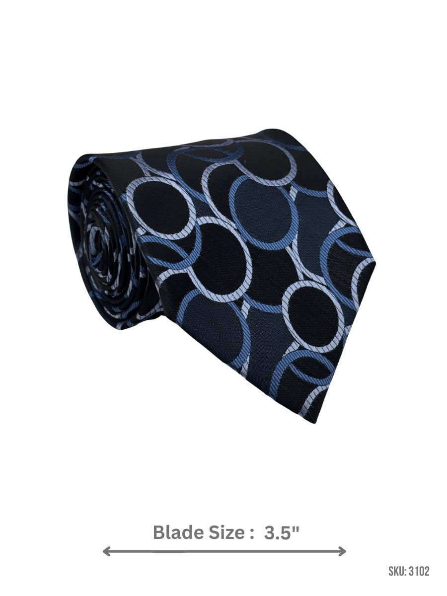 Upgrade your formal style with this black tie designed with navy blue and Light Blue interlocking circle motifs. A refined choice for office wear, dinners, and formal occasions.
