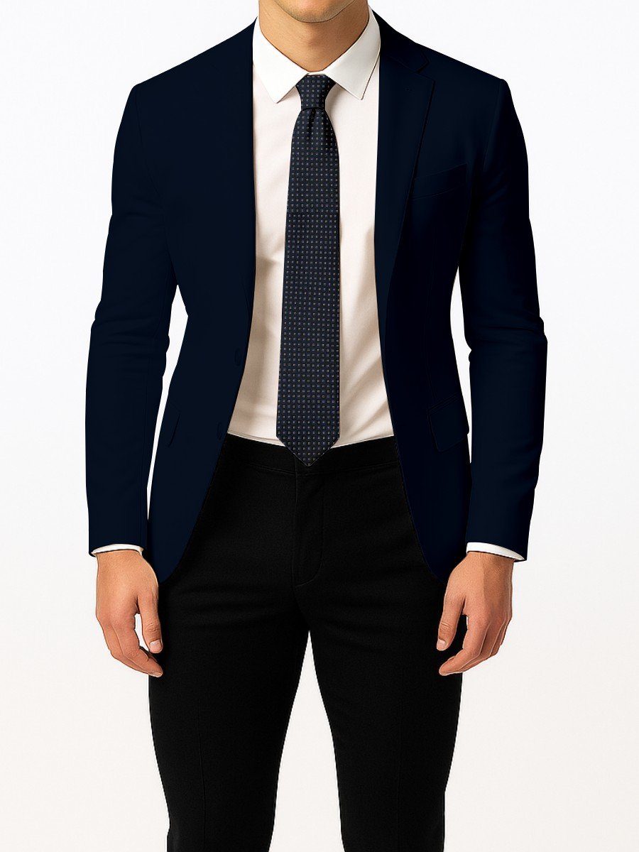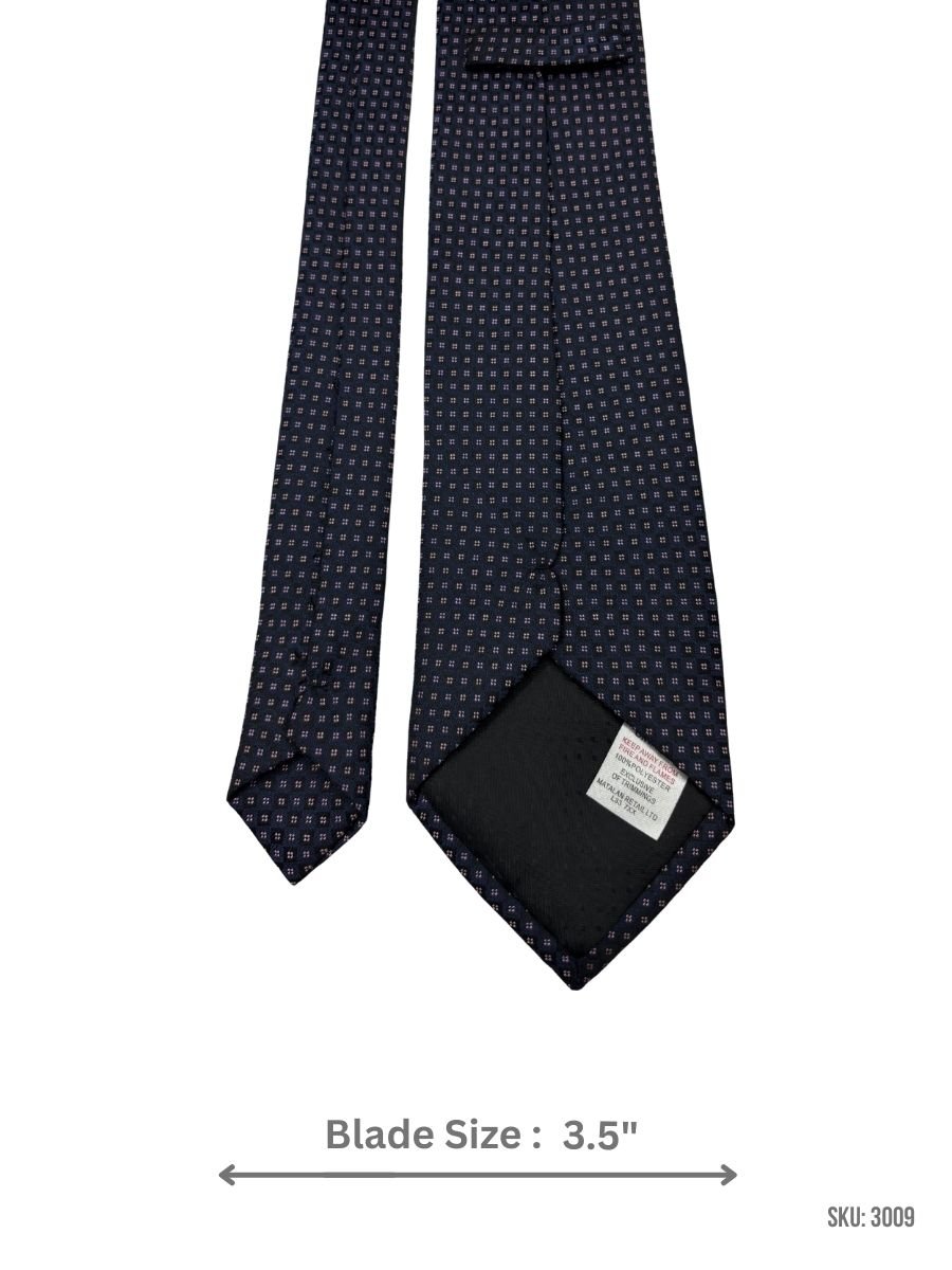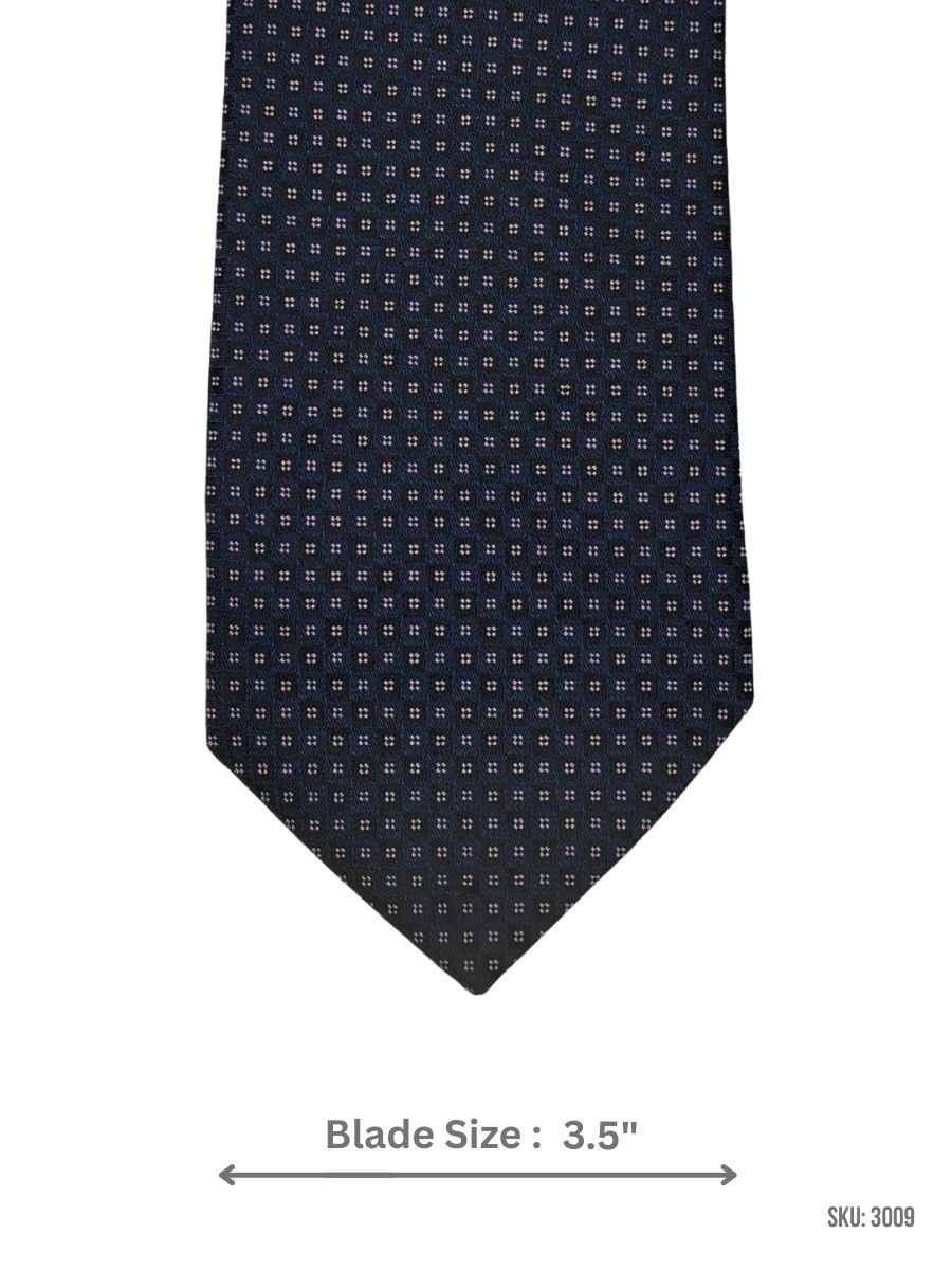 This black tie is finished with an all-over micro square motif in navy blue and white, creating a structured texture and refined contrast. The pattern stays subtle from a distance but adds detail up close—perfect for business attire and formal events with solid shirts and dark suits.