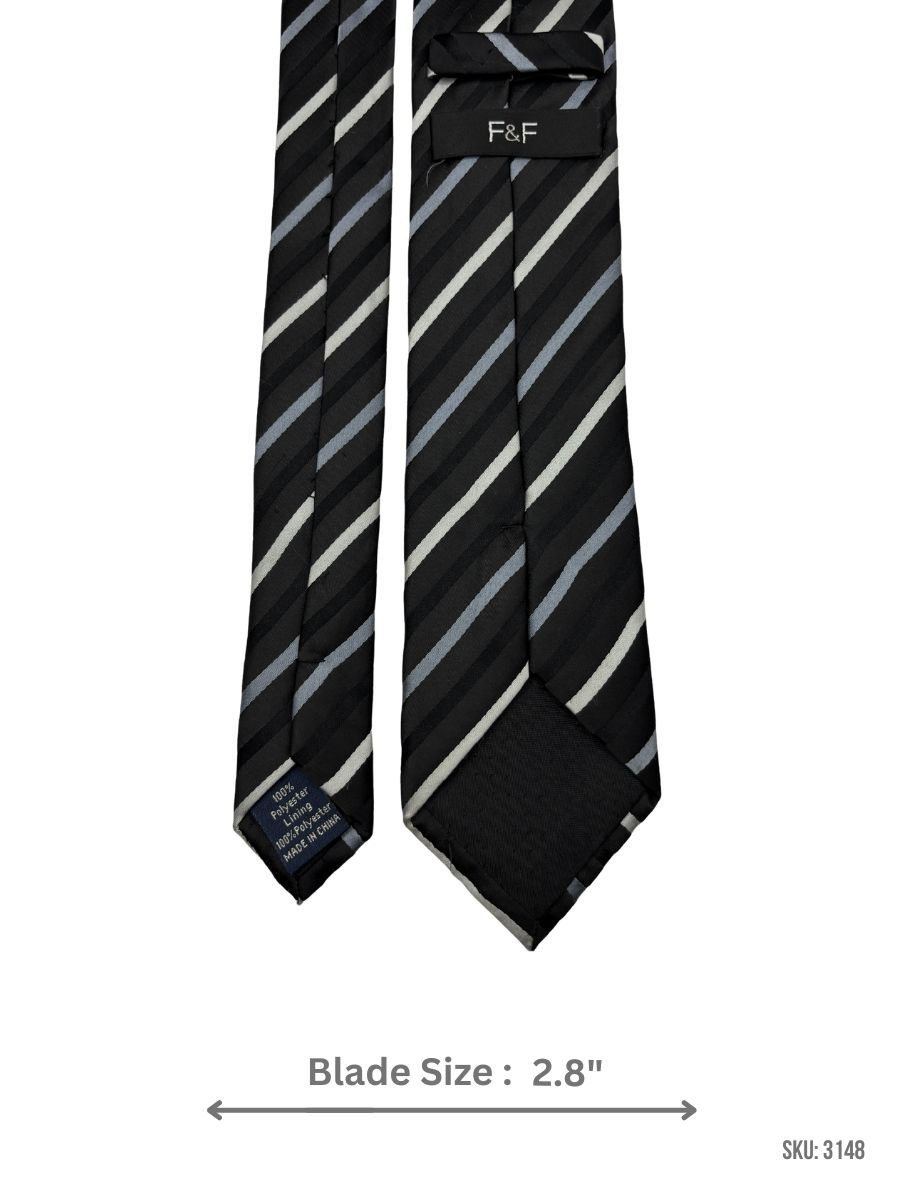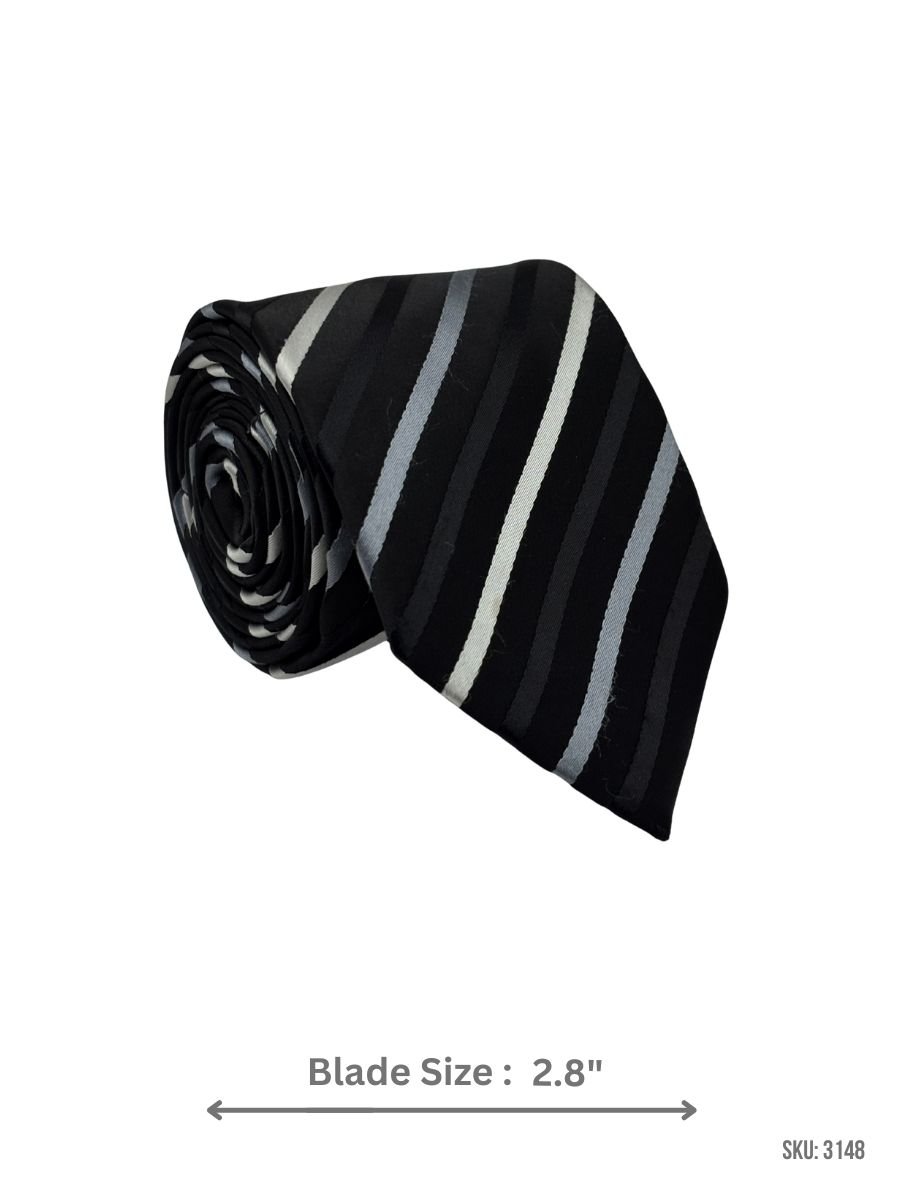 A sleek black tie finished with clean diagonal striping in off-white and slate gray tones. Ideal for office wear, formal events, and polished evening styling.
