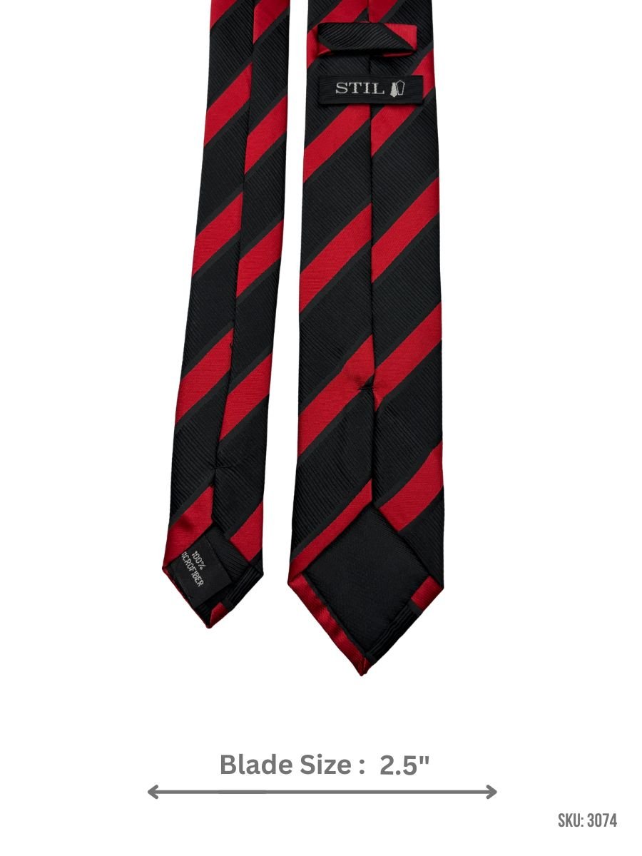 This black striped tie features bold red diagonal bands that create sharp contrast and a timeless, confident style. Ideal for formal events, business wear, and evening outfits, it pairs best with solid shirts and dark suits for a clean, polished finish.