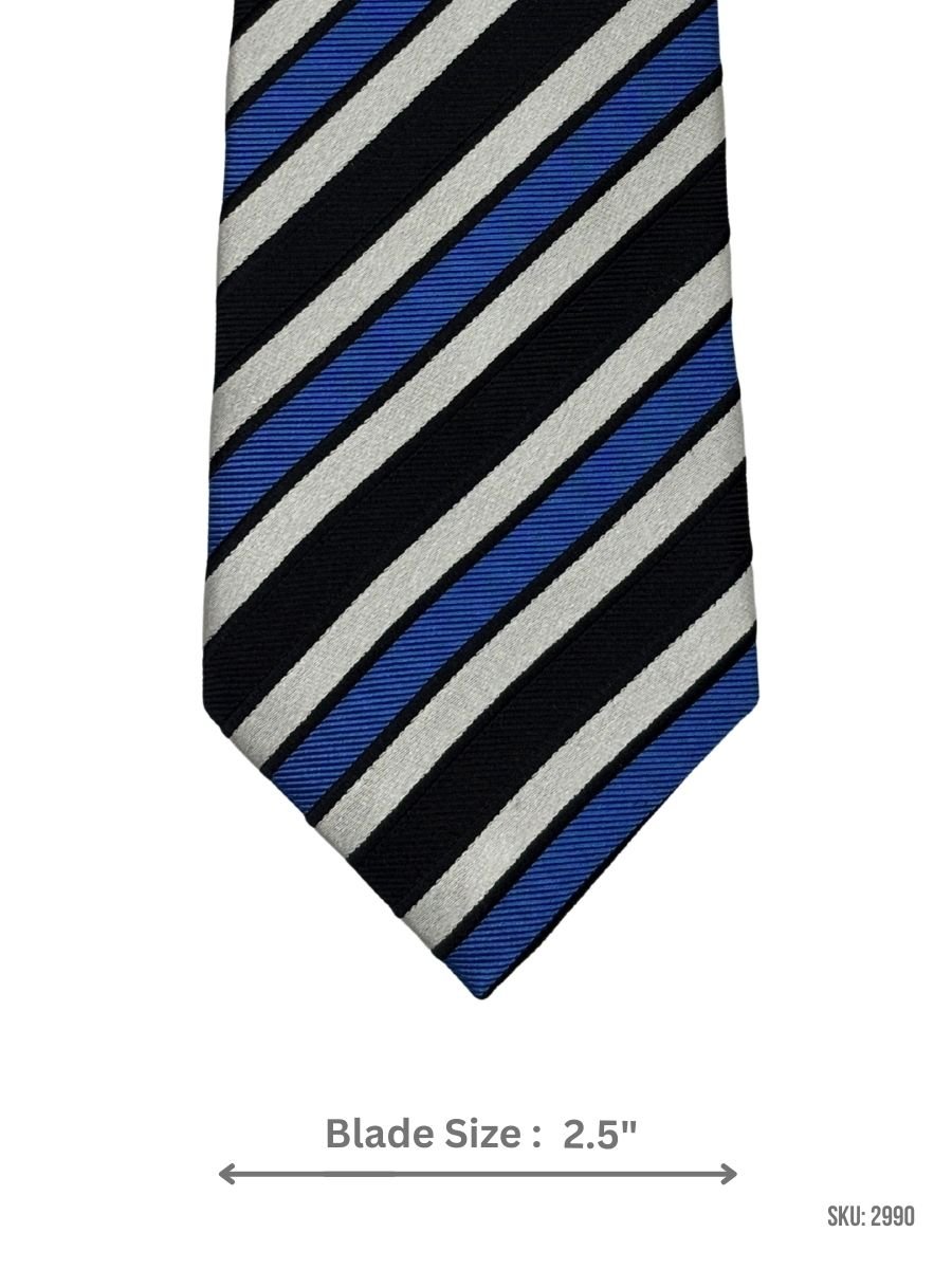 This black striped tie features alternating diagonal bands in royal blue and white for strong contrast and timeless style. Ideal for office wear, meetings, and formal occasions, it works especially well with white or light blue shirts and dark suits for a crisp, confident look.