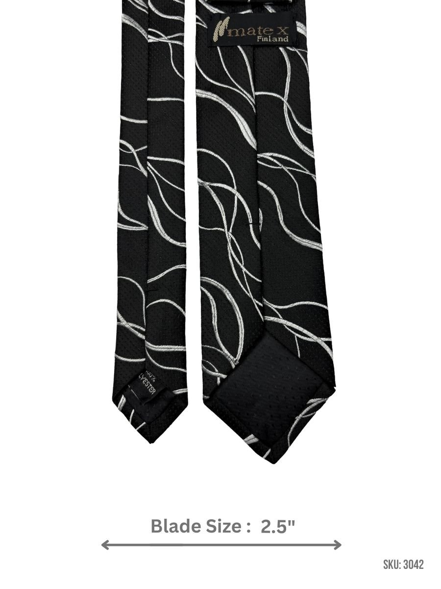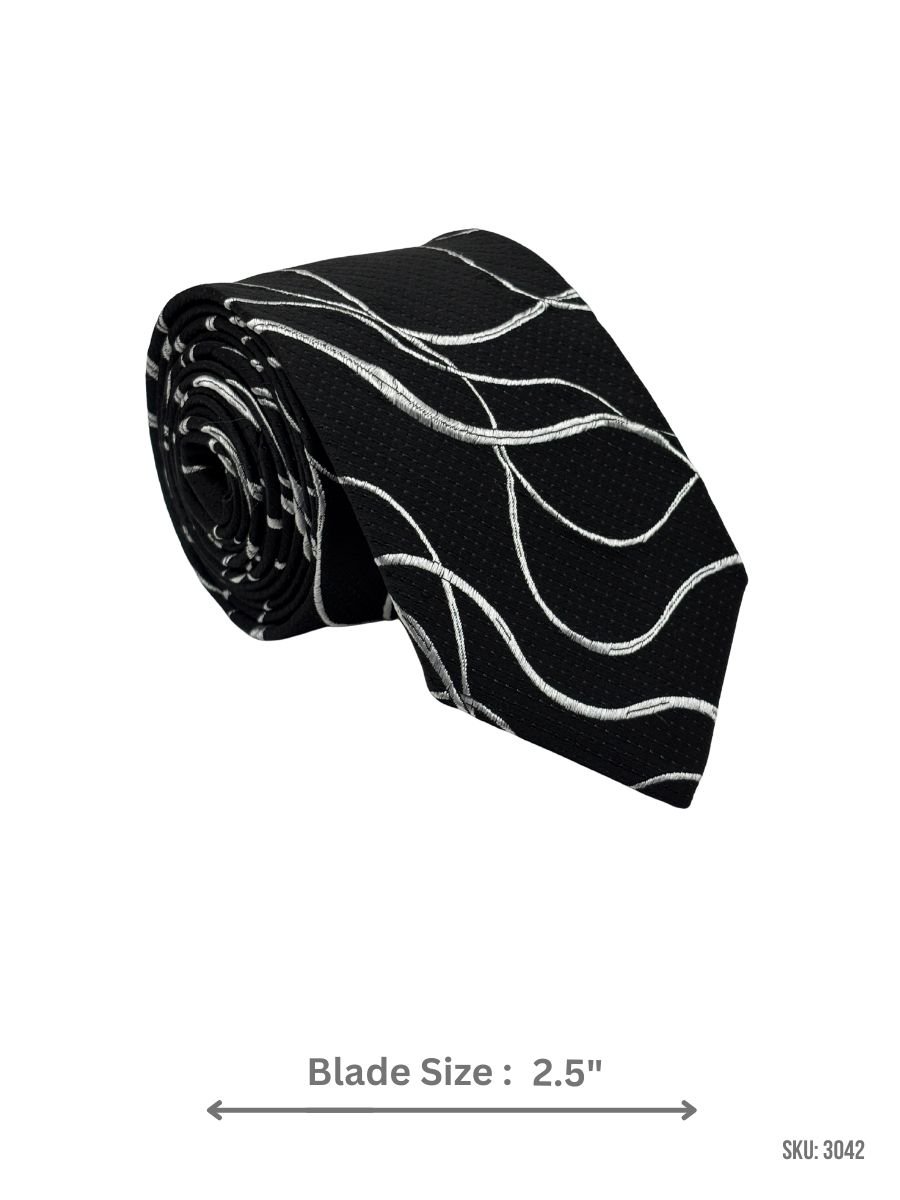 Elegant black tie featuring a silver abstract wave design for a modern, stylish look.