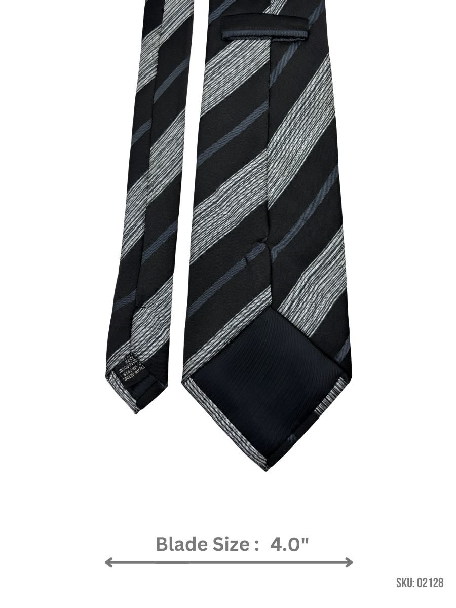 This timeless black tie features understated silver and gray diagonal stripes, making it a versatile accessory for any formal occasion. The 4.0-inch blade width provides a traditional fit, ideal for classic suit styles. Made from premium materials, this tie combines durability and elegance for a polished and confident look.