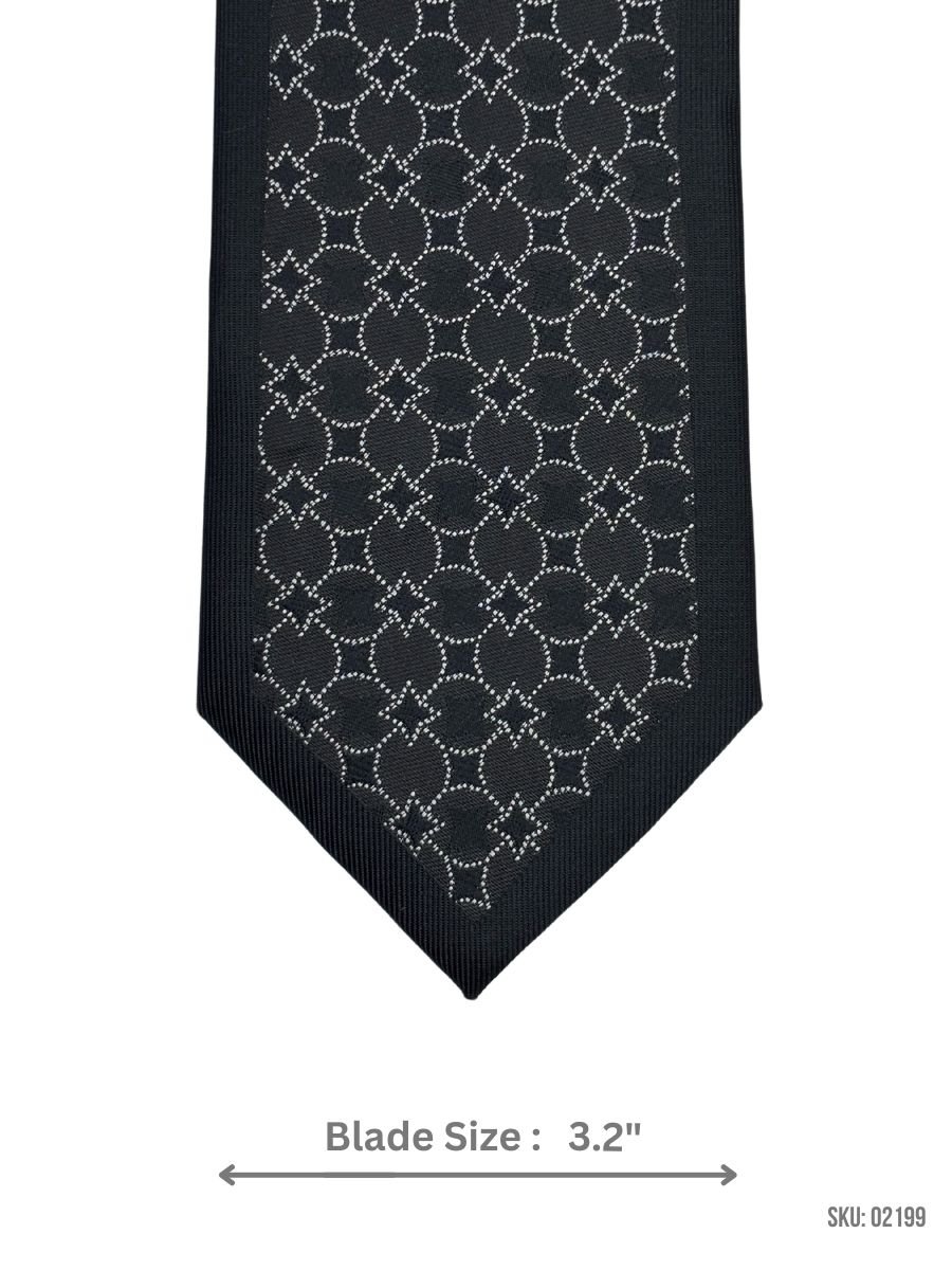 Add a modern touch to your wardrobe with this black tie adorned with a silver star pattern. The 3.2″ blade size creates a balanced, sophisticated look perfect for any formal occasion or special event.