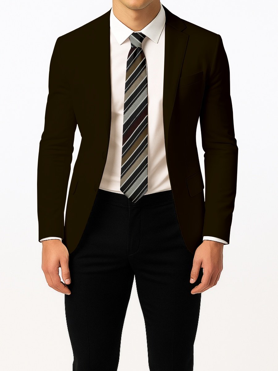 This black tie combines multiple diagonal stripe tones—tan, light grey, and white—for layered contrast that feels classic yet updated. A versatile choice for office wear and formal occasions, it looks best with solid shirts so the stripe pattern stays crisp and balanced.