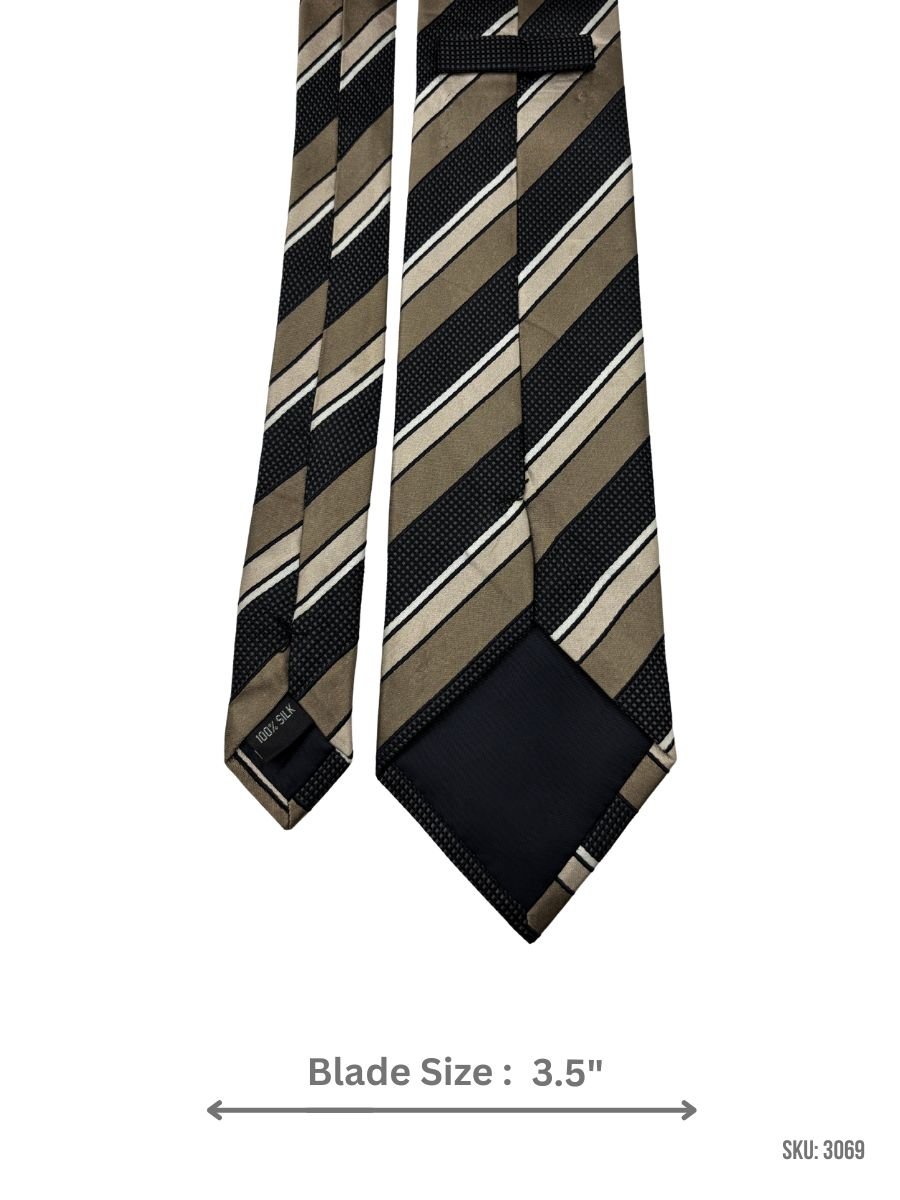 This black striped tie features broad taupe bands and brown stripe accents that add contrast while staying refined. It’s a strong option for business and formal wear—pair it with white, cream, or light blue shirts and dark tailoring for a sharp, coordinated look.