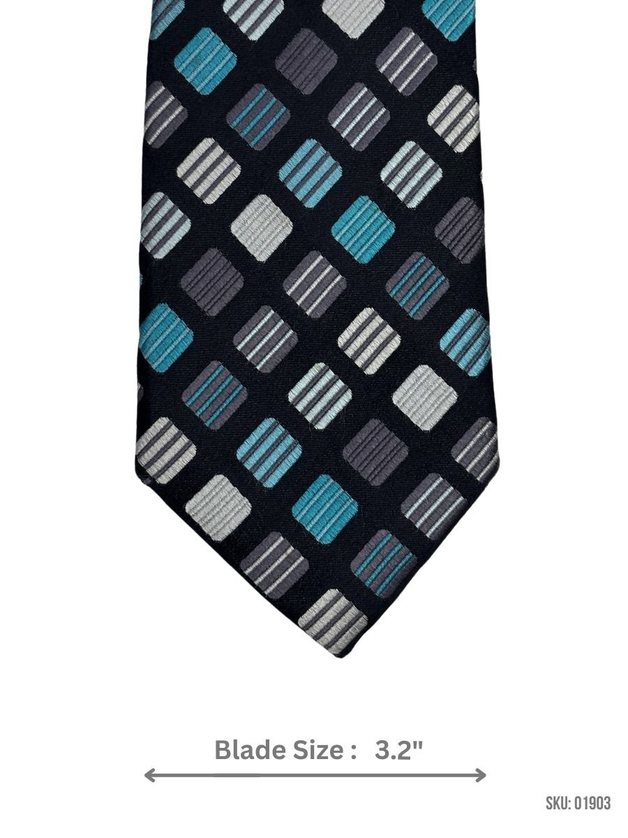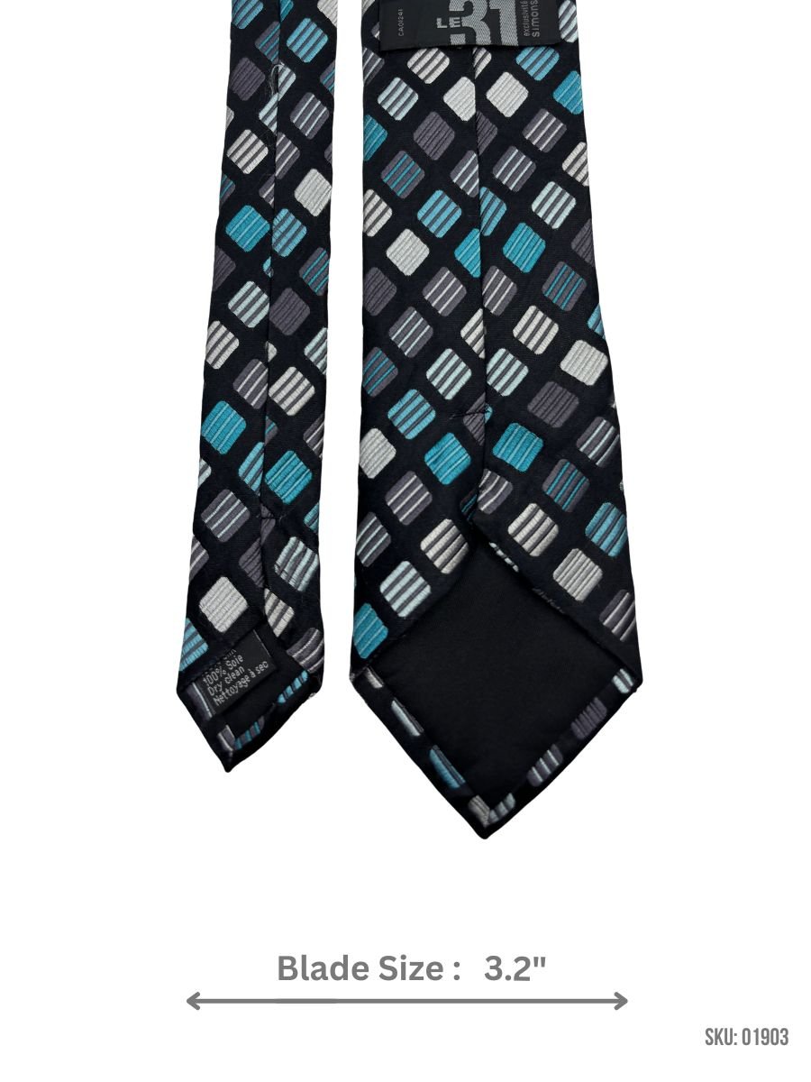 This black tie with a checkered teal and gray design brings a contemporary edge to your wardrobe. With a 3.2-inch blade width, it’s perfect for enhancing both formal and semi-formal ensembles. Whether paired with a white shirt or a dark suit, this tie is a versatile accessory for adding style to your look.