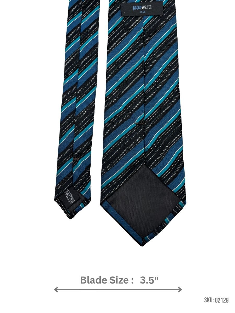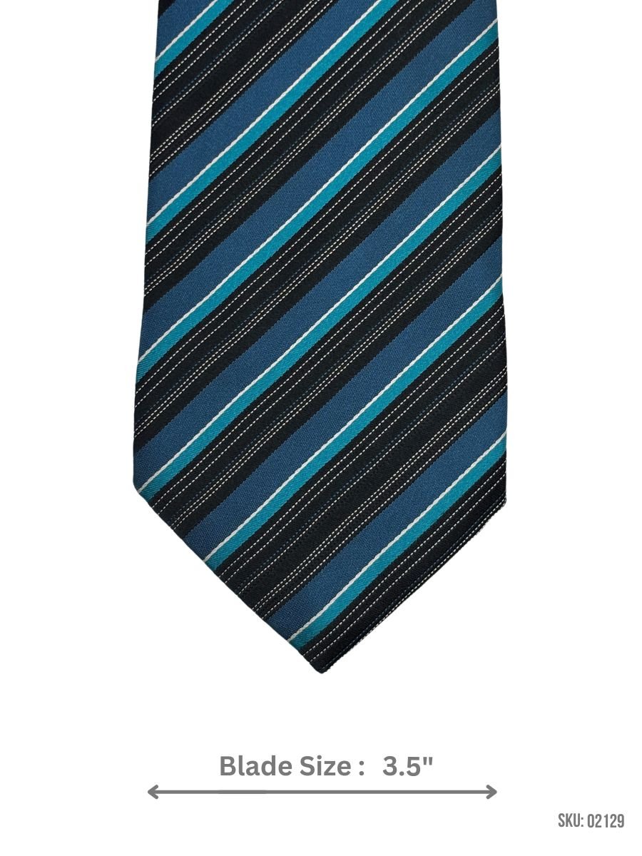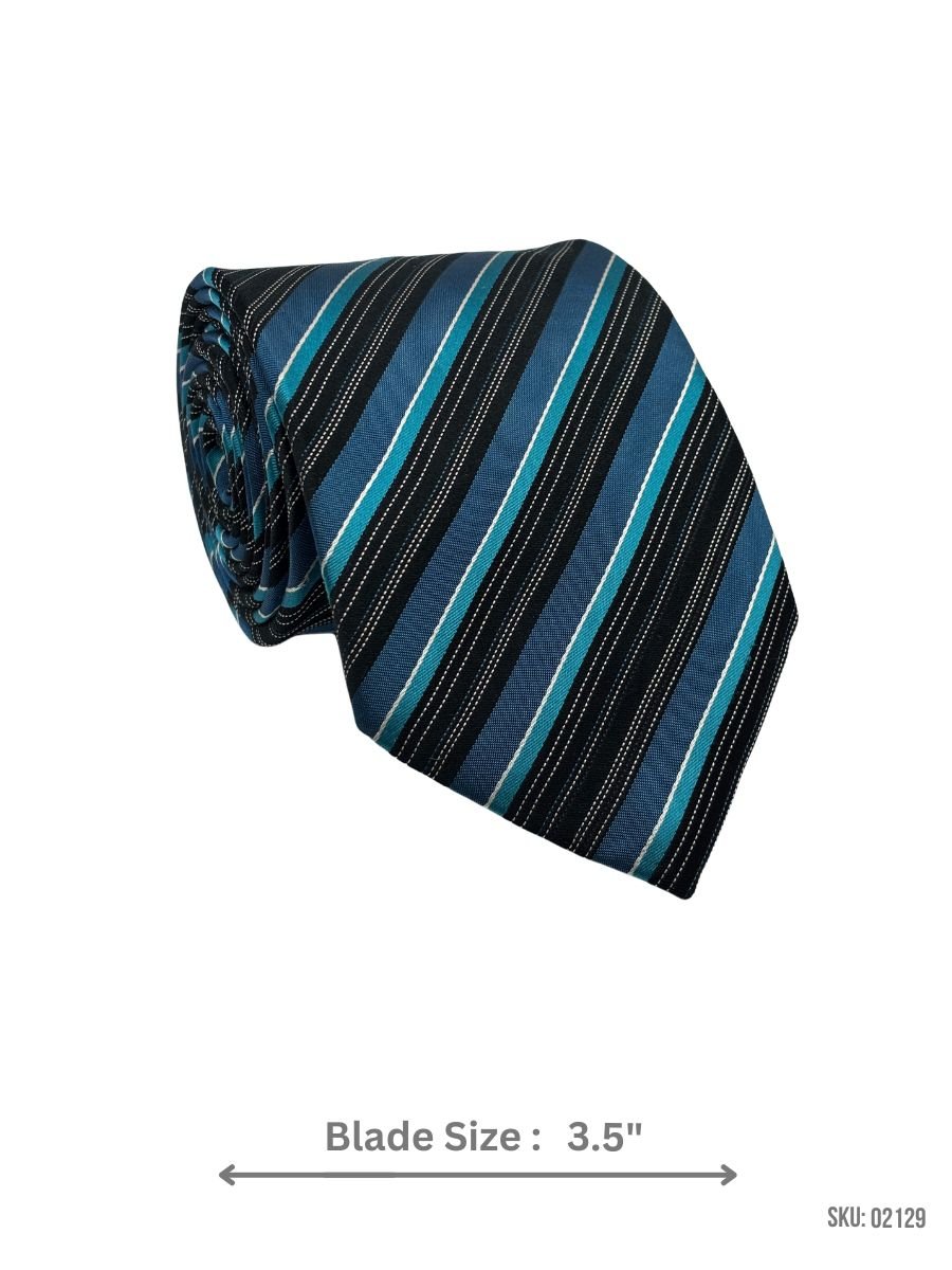 Modern black tie with bold teal and white stripes. A standout accessory for formal and professional events.