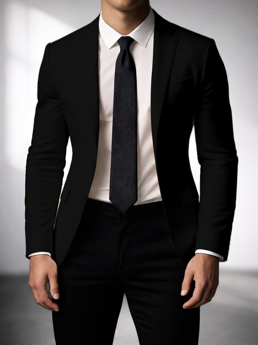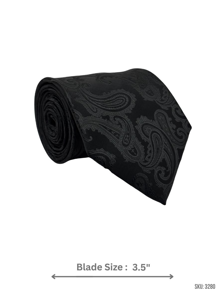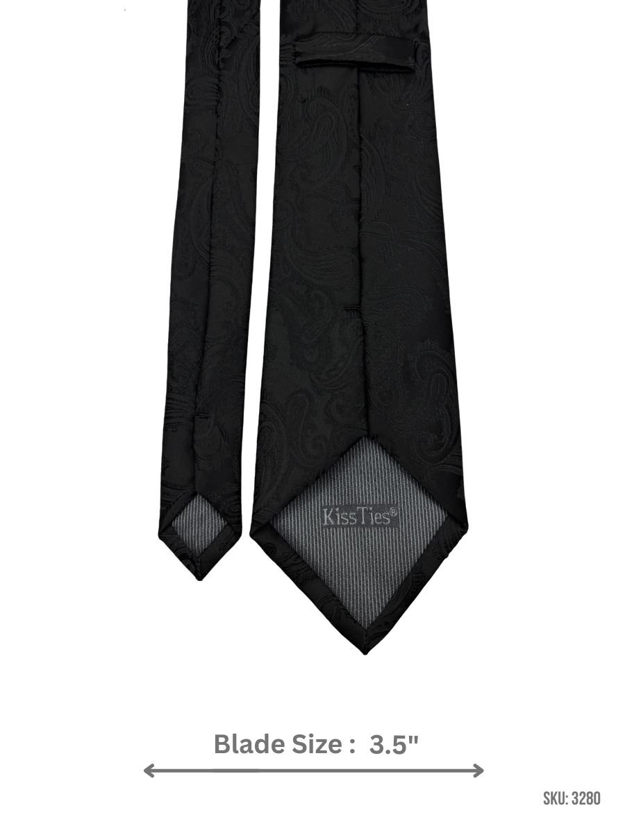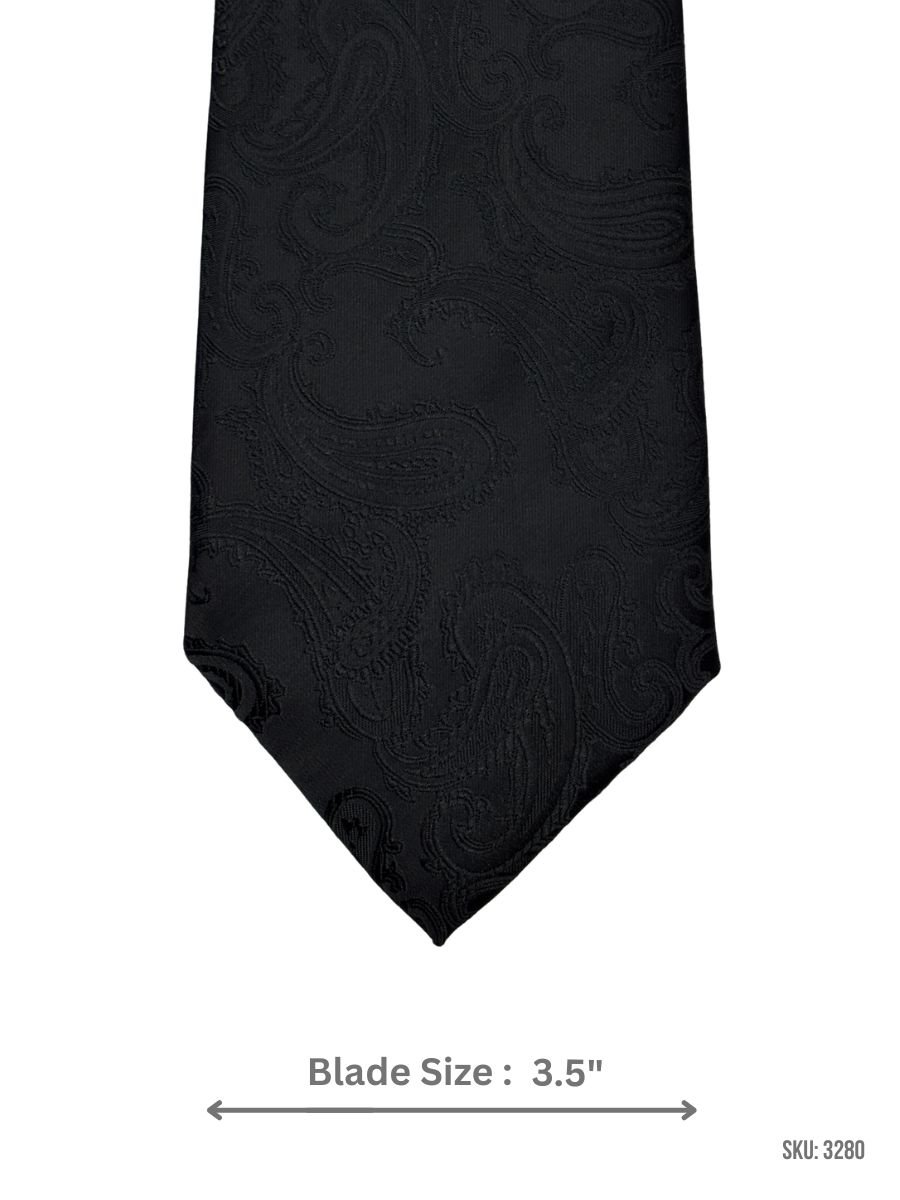 A refined black tie featuring a subtle tonal paisley jacquard weave that adds depth while staying classic and minimal. Ideal for office wear, weddings, and evening formal looks. Blade size: 3.5″.