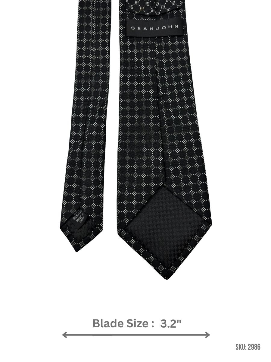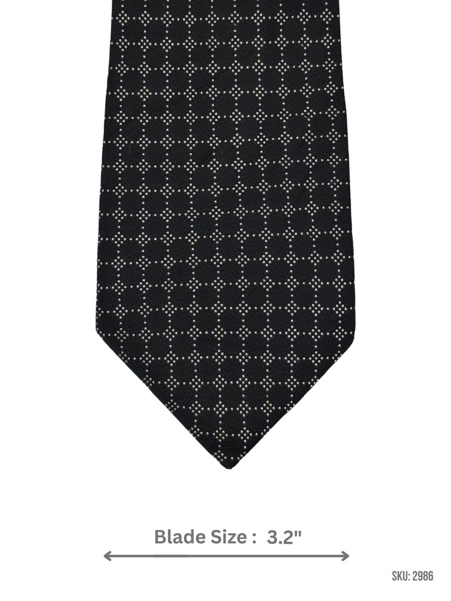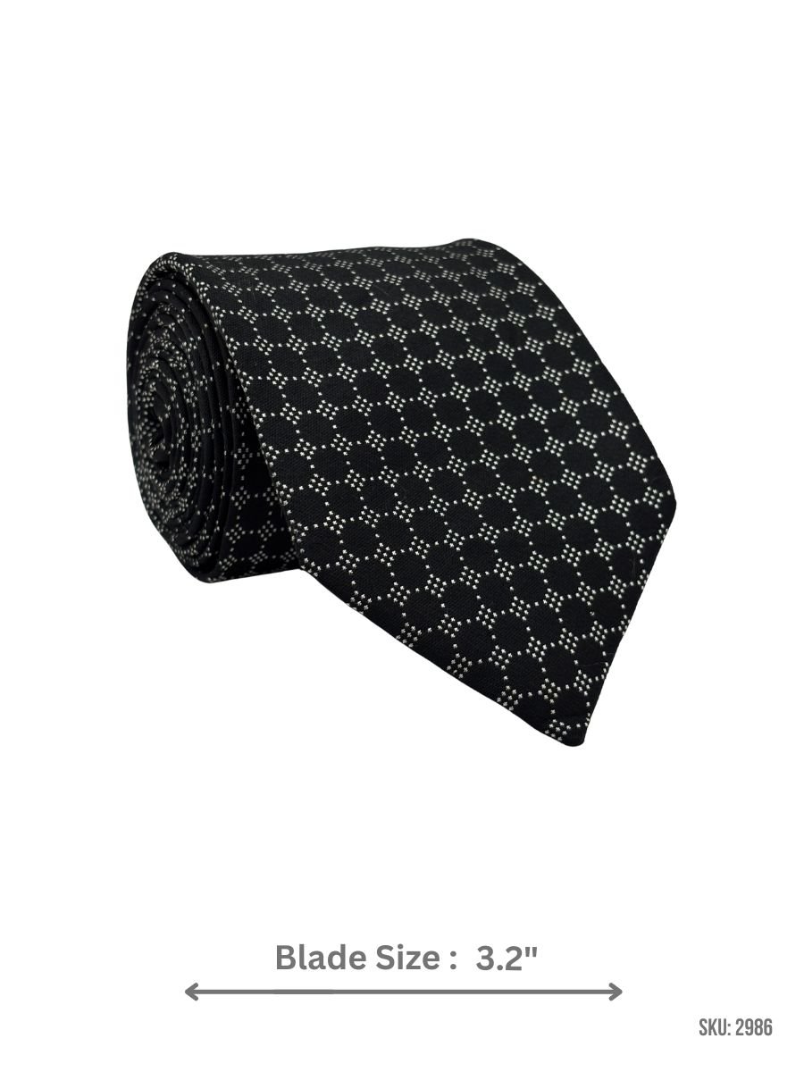 This black tie is designed with an all-over white dotted circle geometric pattern that adds texture and visual depth while staying refined. The high-contrast motif gives a modern, structured feel, making it an easy choice for business wear, evening events, and formal occasions—best paired with solid shirts and dark suits.