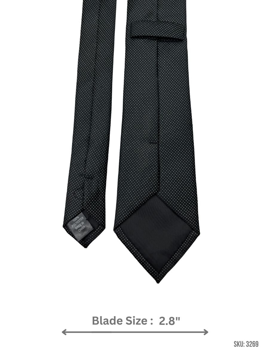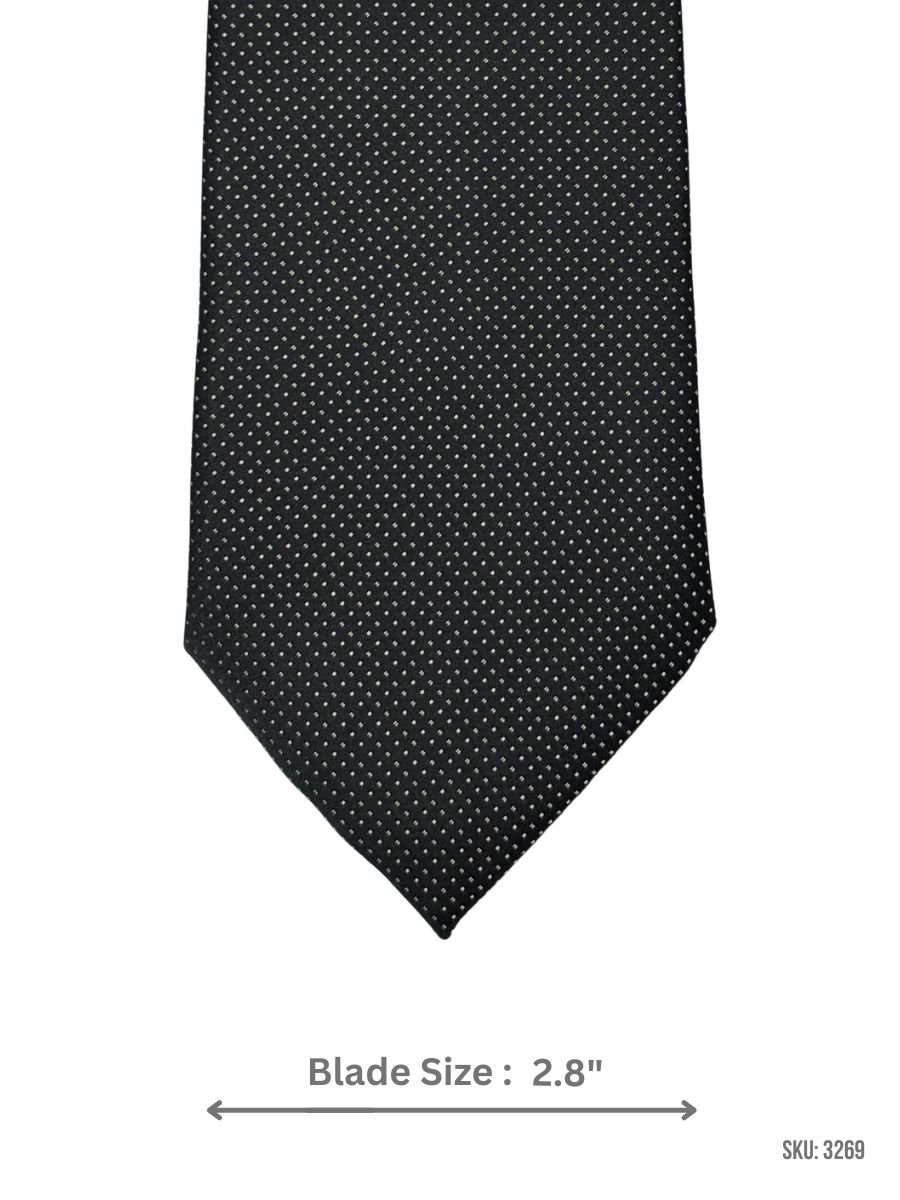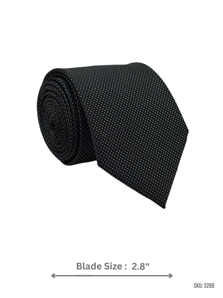 A sleek black tie finished with a neat micro dot pattern in white for subtle contrast and easy styling. Ideal for office wear, meetings, and formal occasions. Blade size: 2.8″.