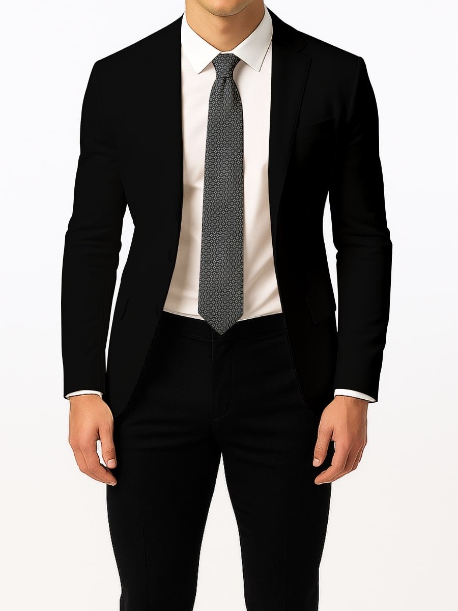 This black tie with a geometric pattern brings a modern and refined look to your outfit. The sharp design adds visual interest, making it suitable for business and formal events. Crafted from premium fabric, this tie offers durability, comfort, and a sleek look that fits perfectly with any business or semi-formal attire.