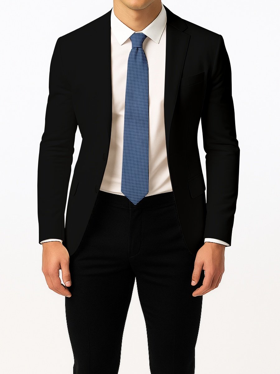 A blue tie finished with a light blue mini circle grid that adds texture and detail while staying elegant. Great for meetings, office outfits, and formal gatherings with solid shirts.