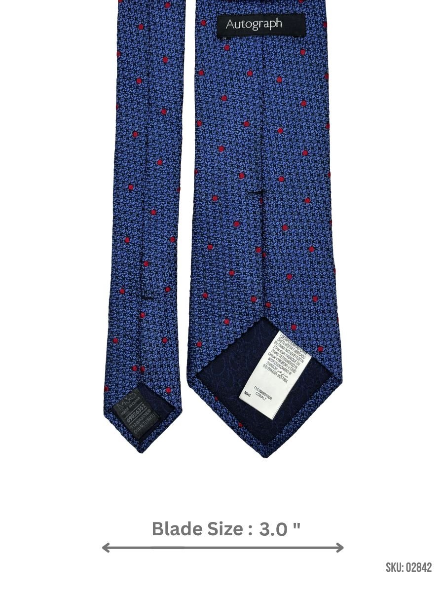 A blue tie accented with fine red micro dot detailing.