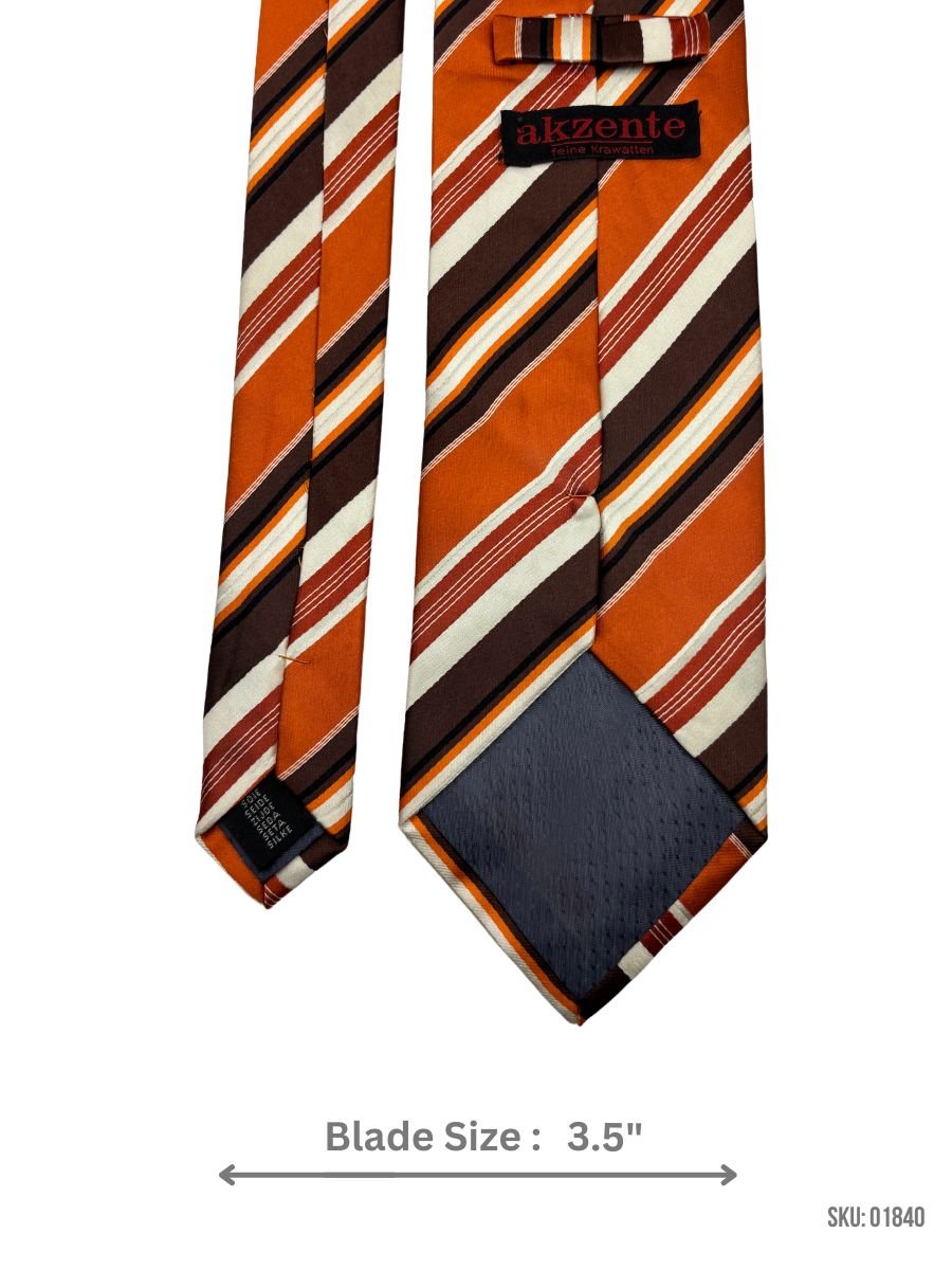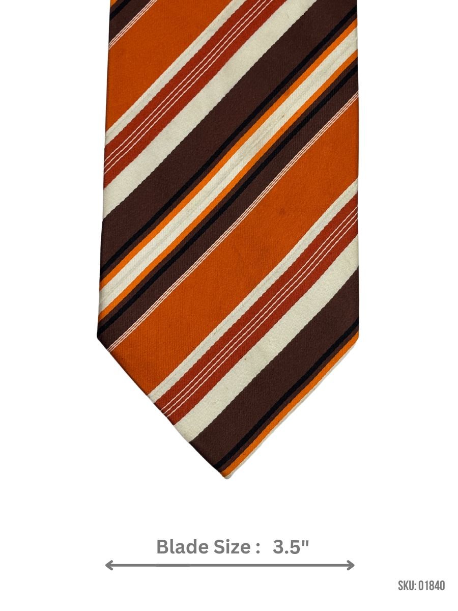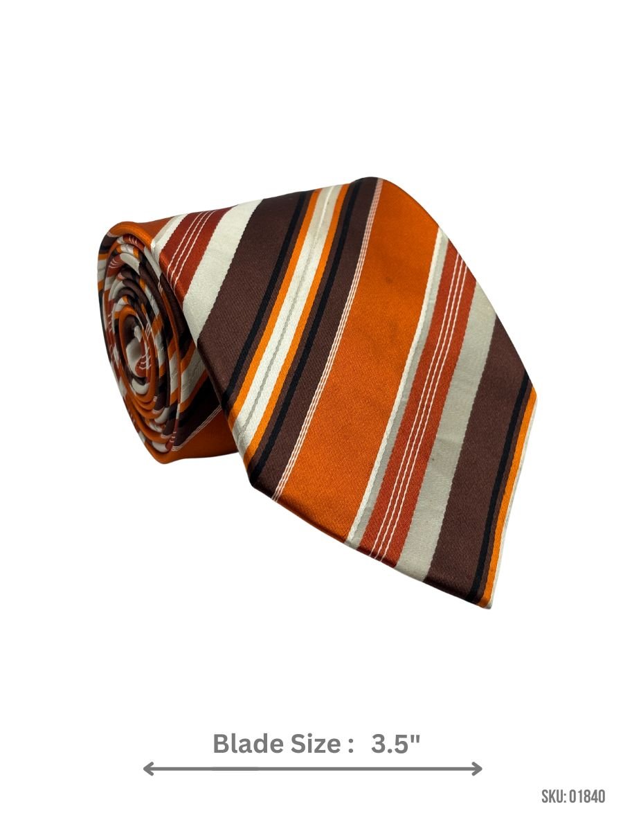 Make a statement with this bold orange tie, accented by brown and white stripes. Its 3.5-inch blade adds a classic touch, suitable for both casual and formal wear.