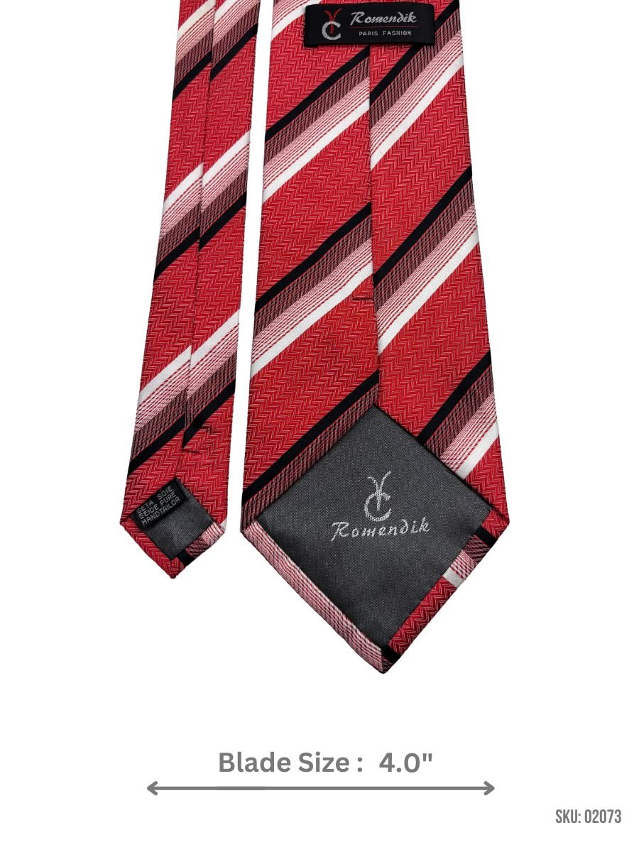 Vibrant red tie with bold black and white stripes. 4.0″ blade width for a classic yet striking look.