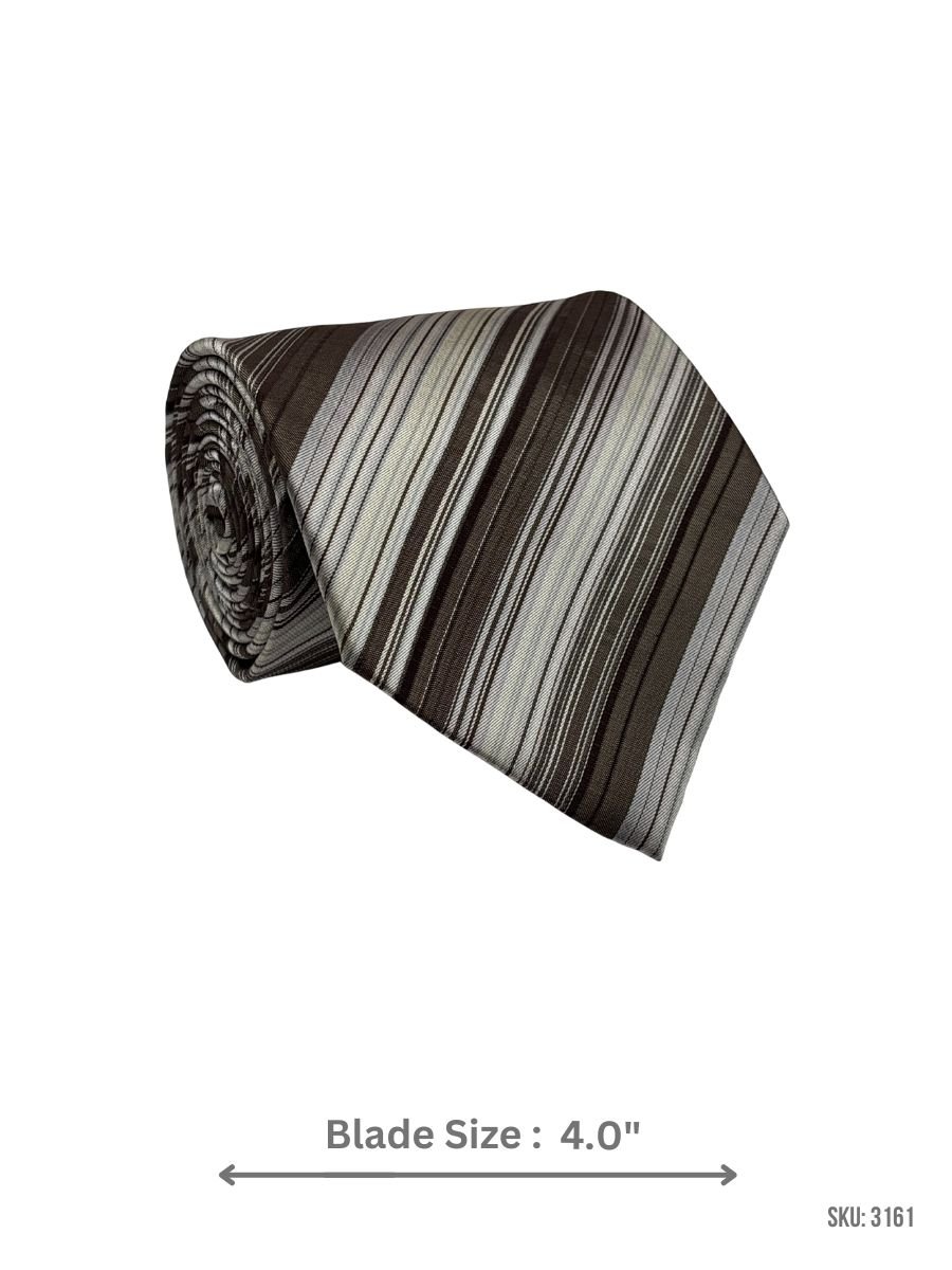 This brown tie combines layered diagonal striping in beige, light gray, and white for a timeless look with added texture. Perfect for business wear, weddings, and formal occasions.