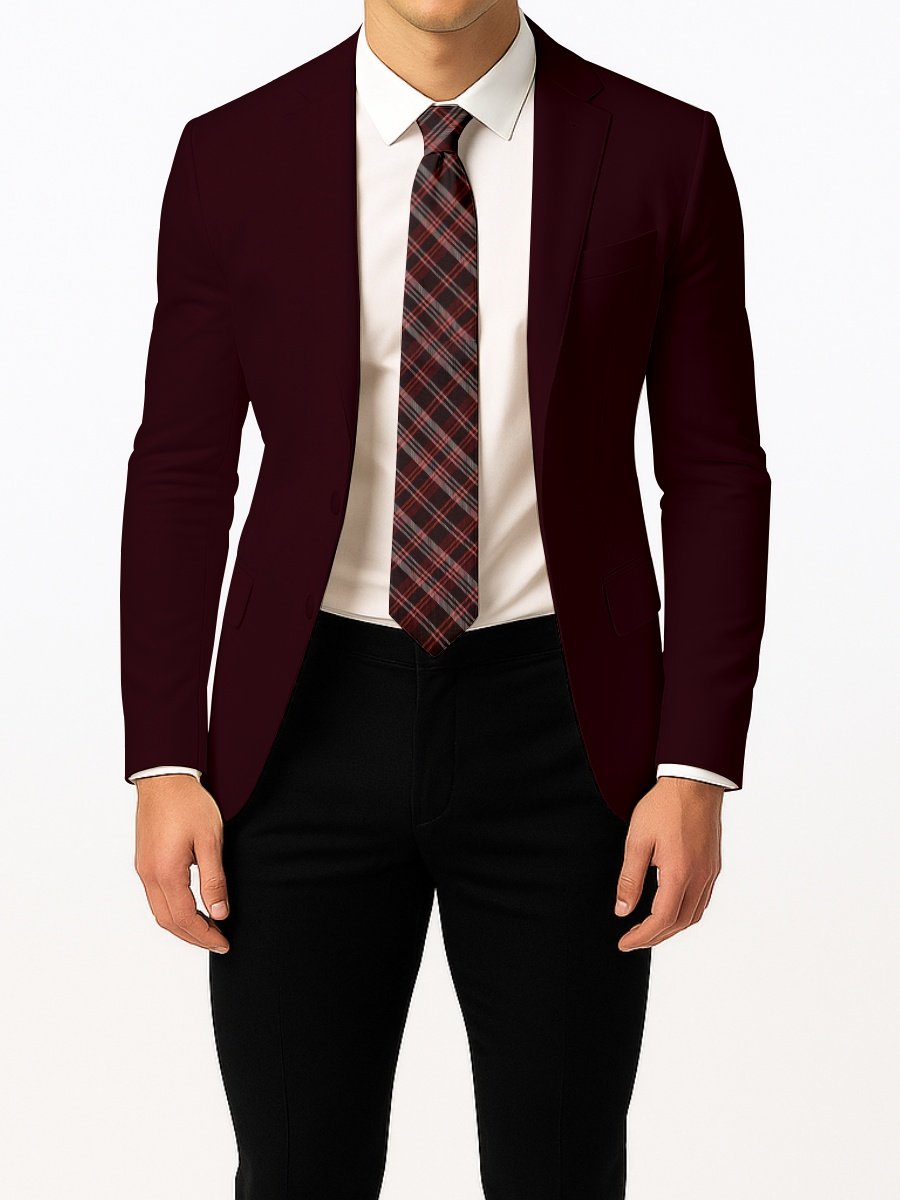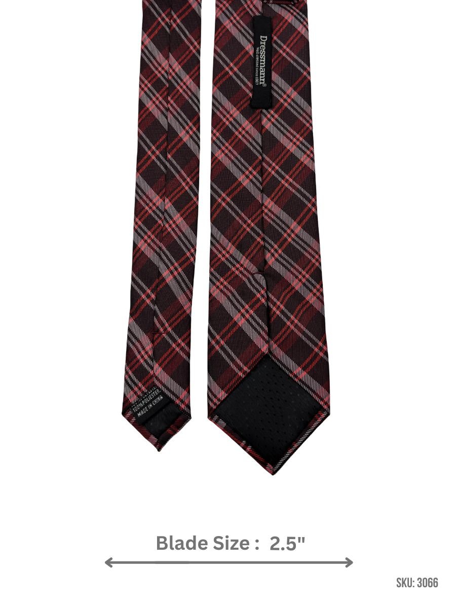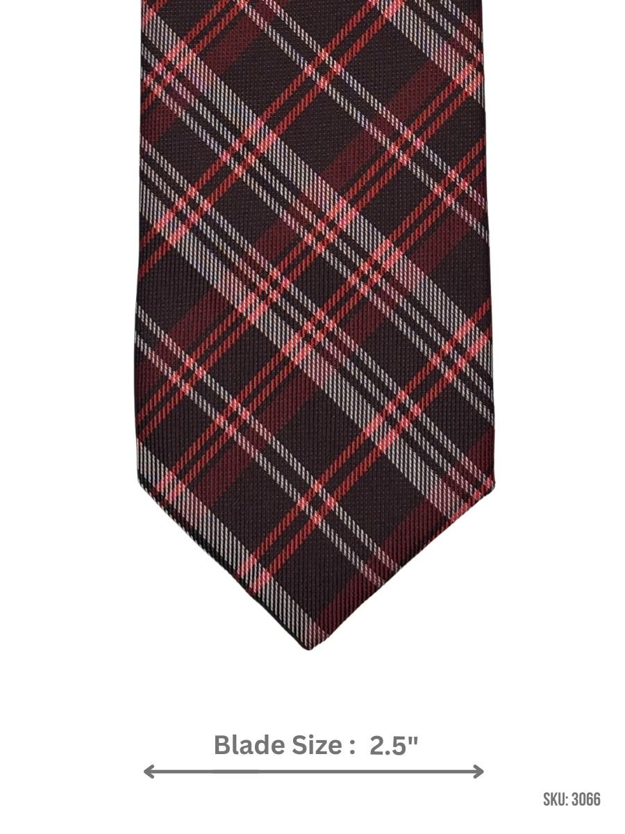 Stylish brown tie accented with red and gray plaid for a bold, classic look.