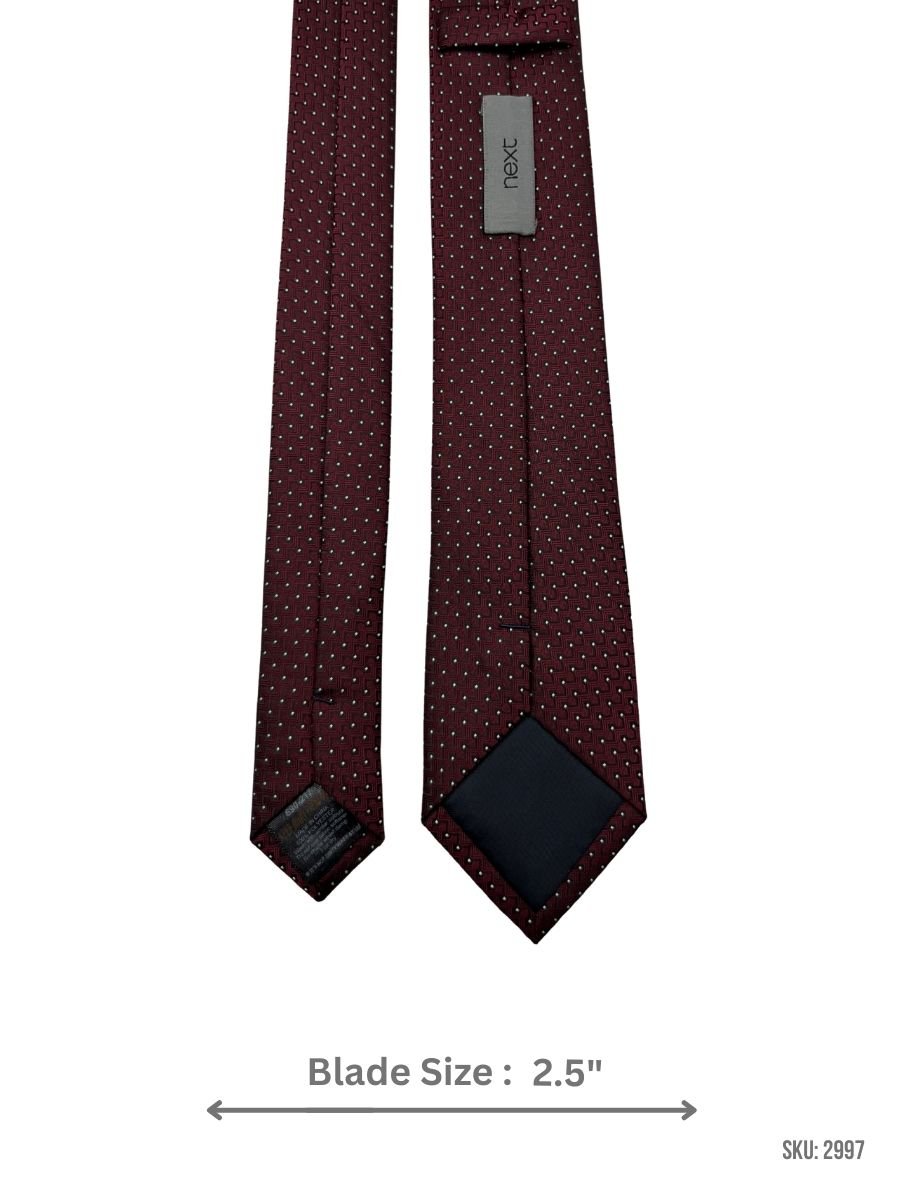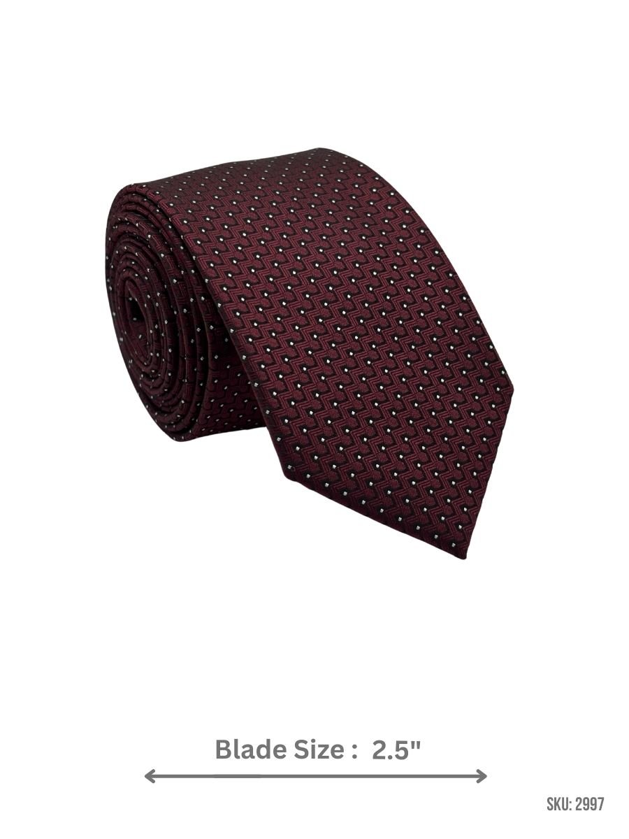 This burgundy tie showcases an interlocking black geometric step pattern with small white micro dots that add contrast and structure. Ideal for dress occasions and elevated office styling, it pairs best with solid shirts and dark suits to keep the look clean and sophisticated.