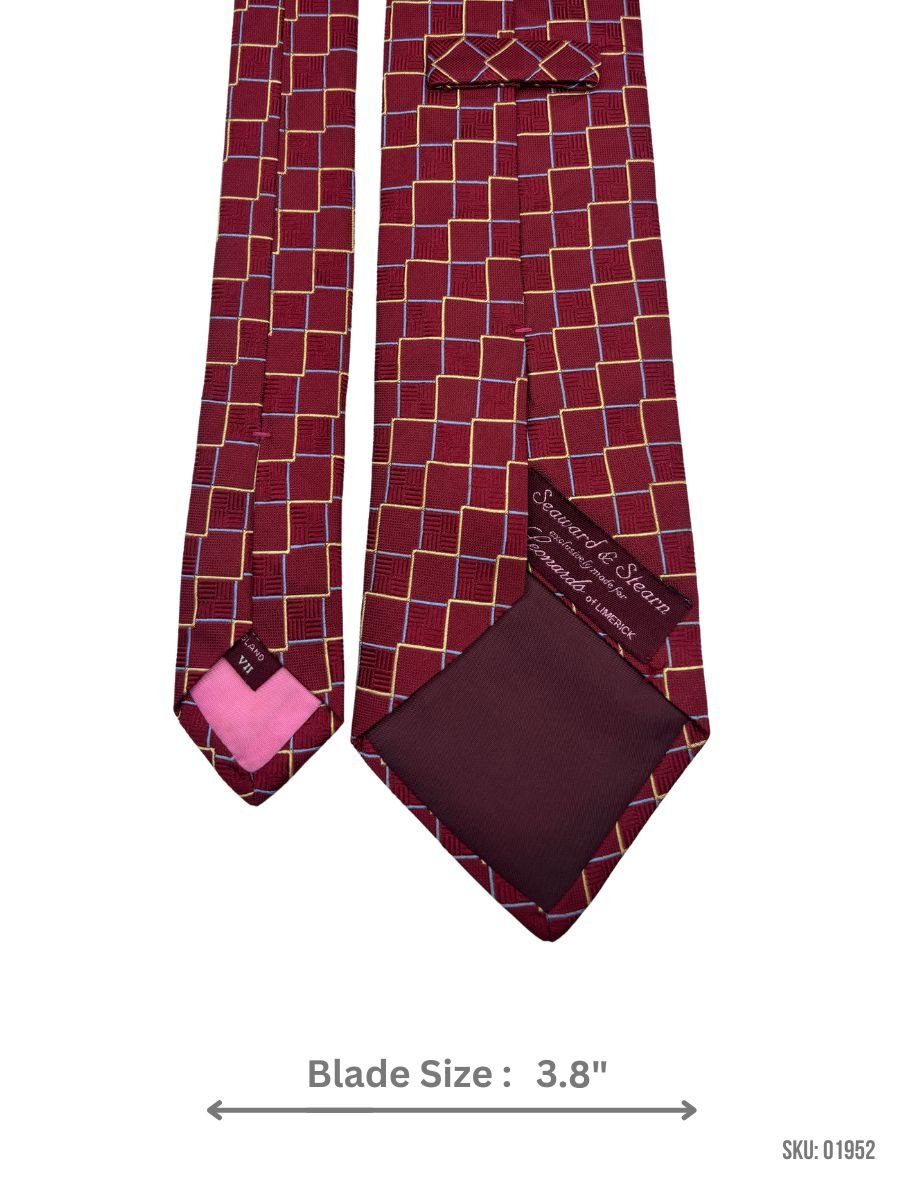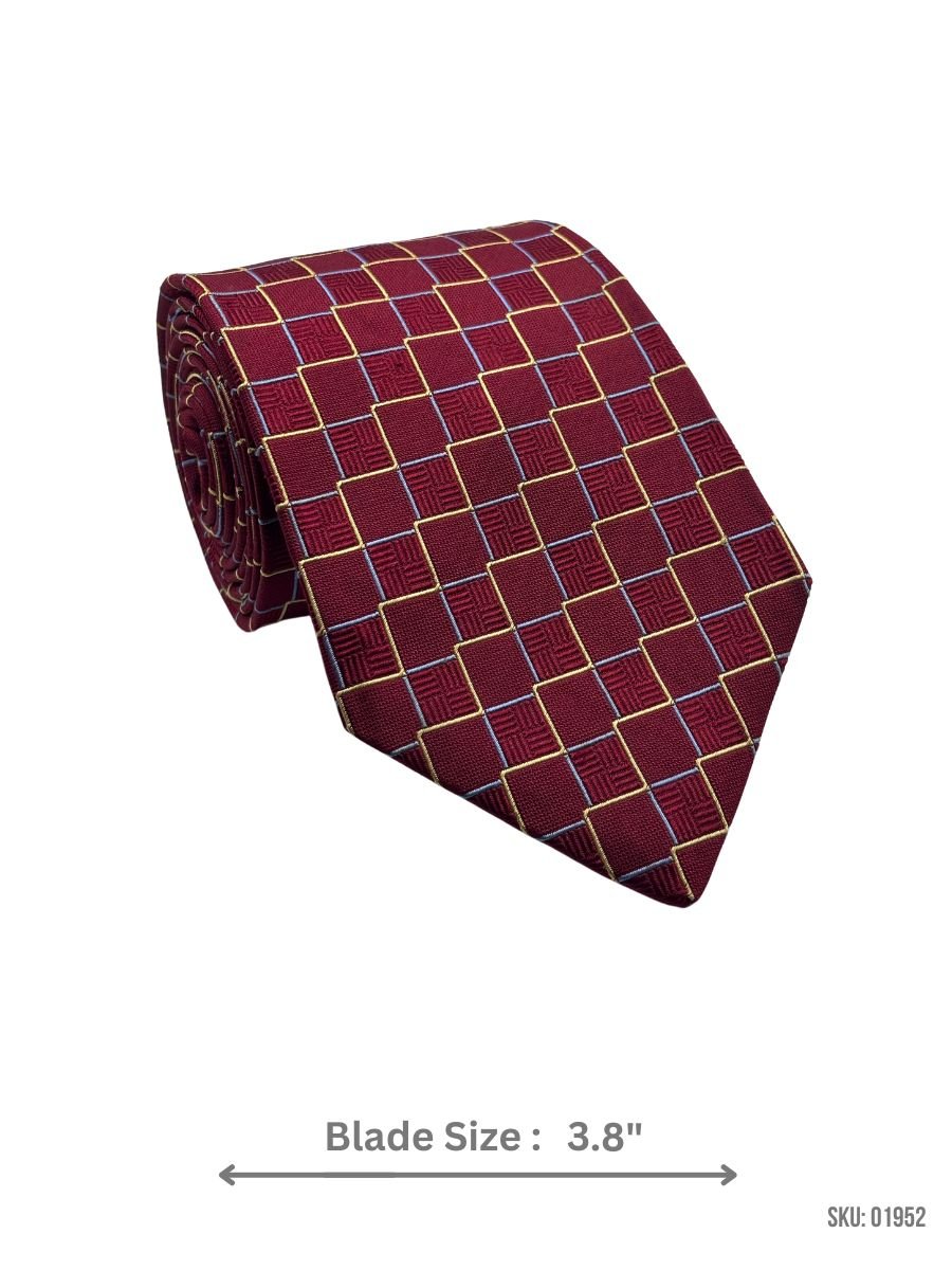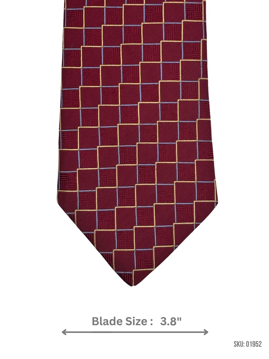 This burgundy tie is adorned with a stylish gold and blue square pattern, creating a refined and sophisticated look. The 3.8-inch blade width provides a classic silhouette, ideal for formal occasions or business attire. Made with premium materials, this tie ensures durability and a polished finish.