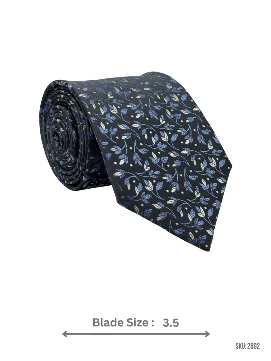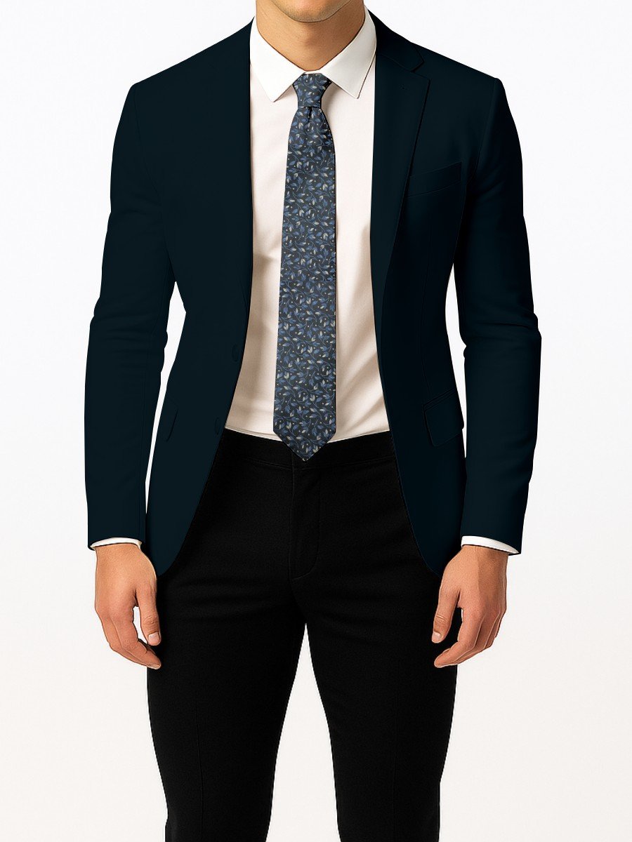 This elegant men’s tie combines a Charcoal Grey base with carefully woven blue and white floral leaves, creating a refined patterned look suitable for office wear, events, or evening attire. Its subtle texture and modern botanical design add sophistication without being overly bold.