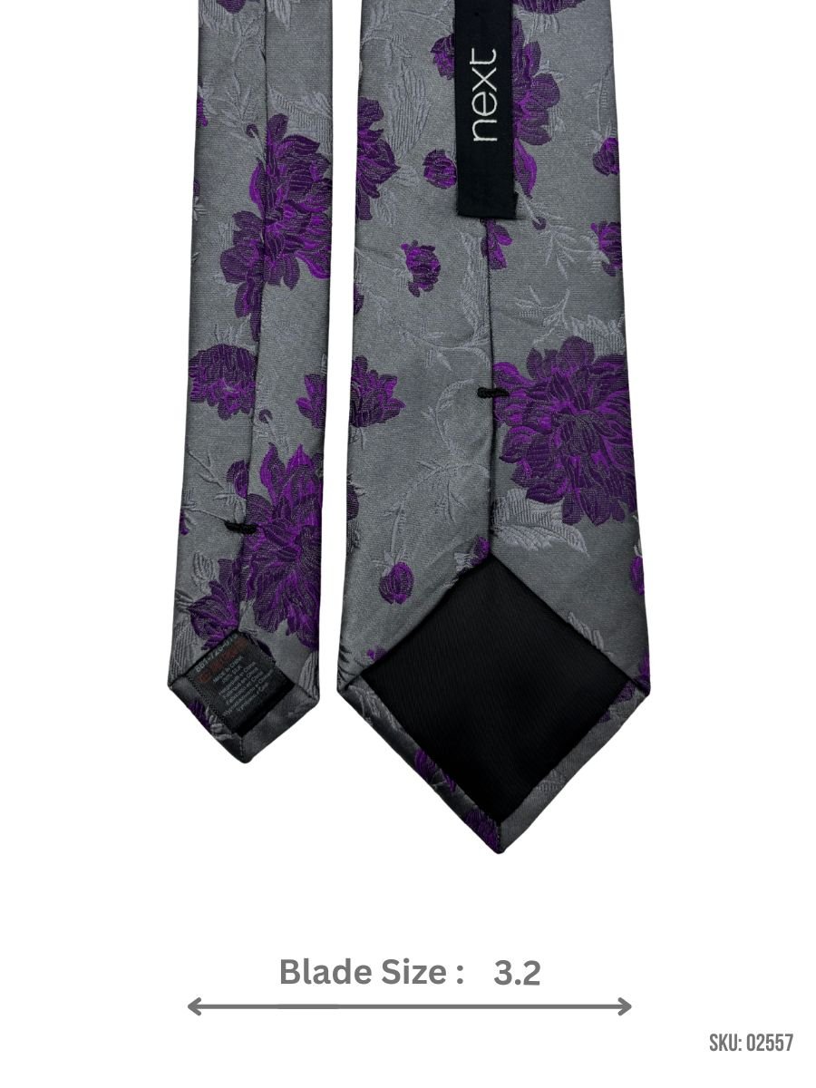 Elegant grey tie with a bold purple floral design for a refined and sophisticated look.