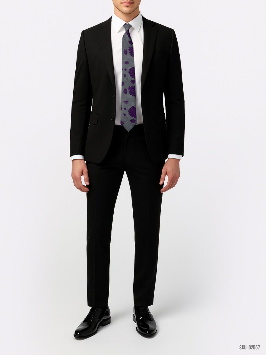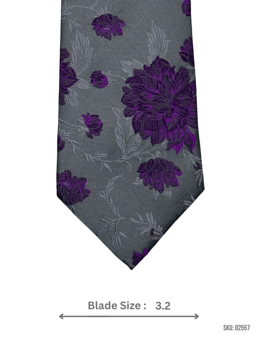 Enhance your formal or business attire with this grey tie featuring a rich floral pattern in purple. The intricate floral design adds a touch of class and elegance, making it perfect for professional settings or upscale events.