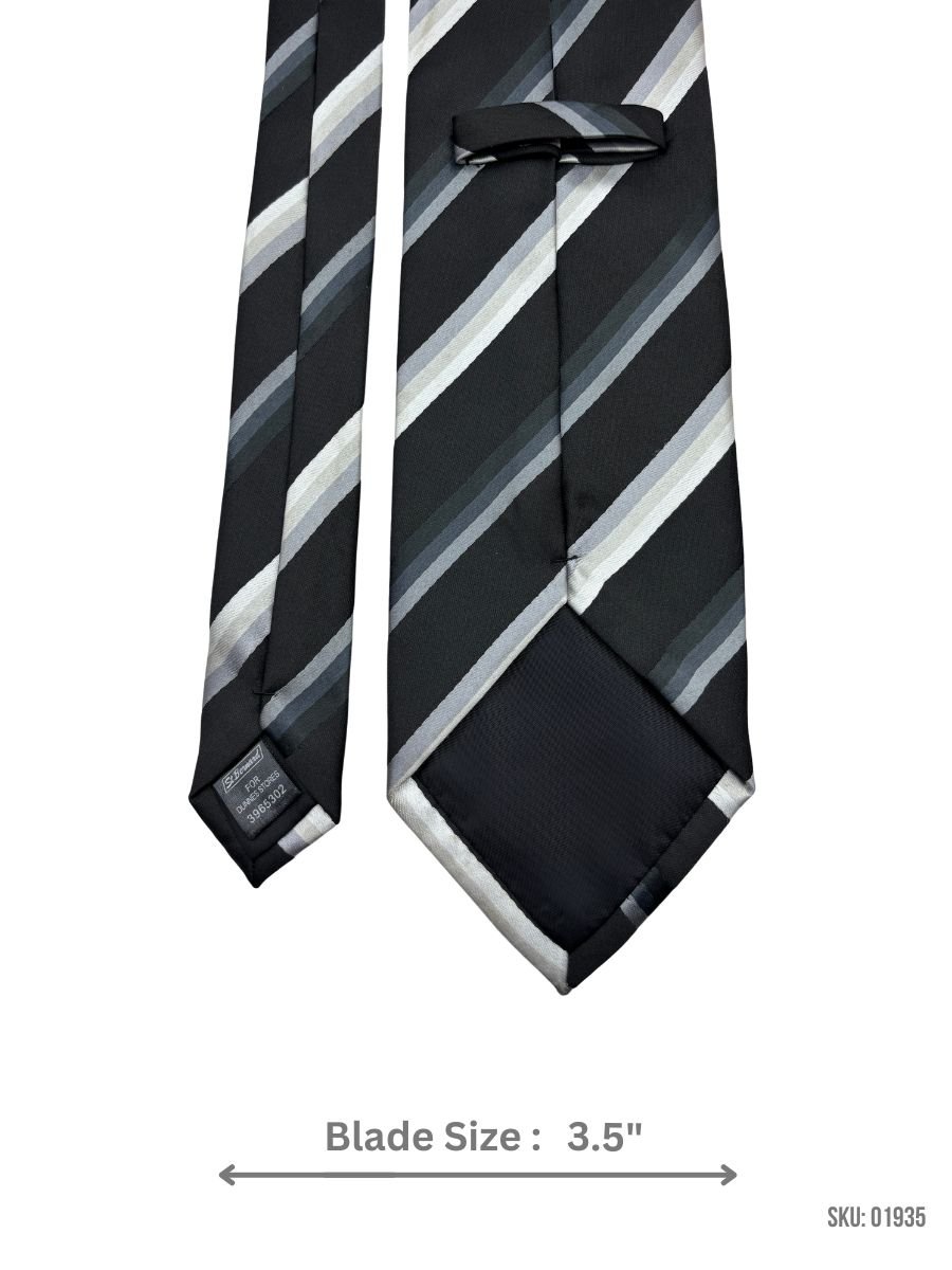 This black tie with refined grey stripes is a perfect blend of style and sophistication. The 3.5-inch blade width ensures a sleek and modern silhouette that complements any suit. Crafted from premium materials, this tie provides both comfort and durability, making it suitable for business meetings, weddings, or any formal occasion. Its timeless color combination ensures versatility, adding a polished finish to your wardrobe